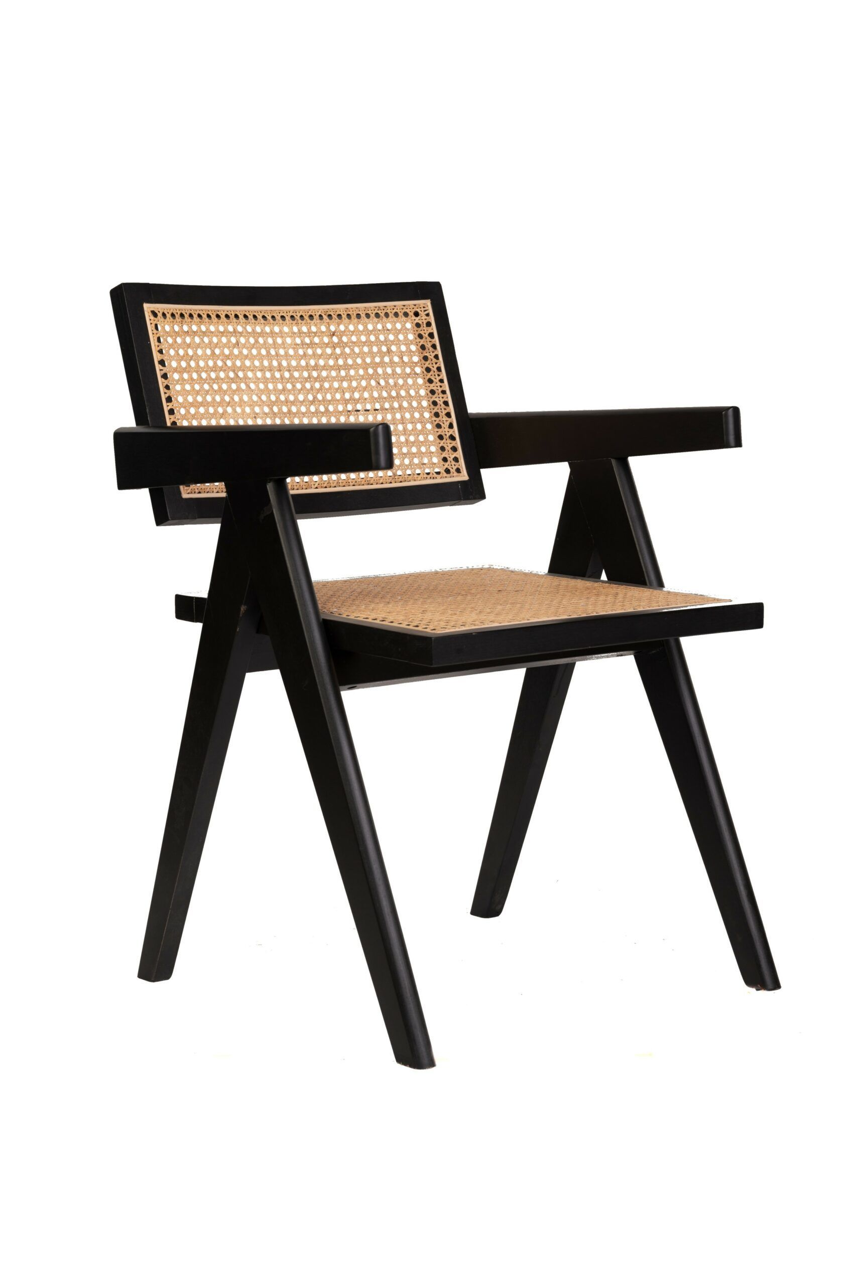Sillón de madera de haya con asiento y respaldo de ratán, perfecto para interiores.
