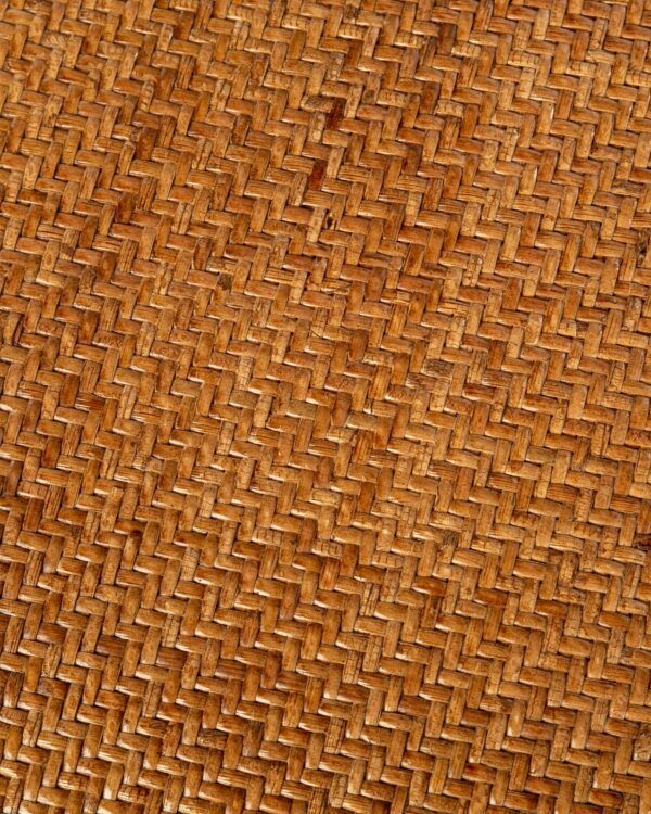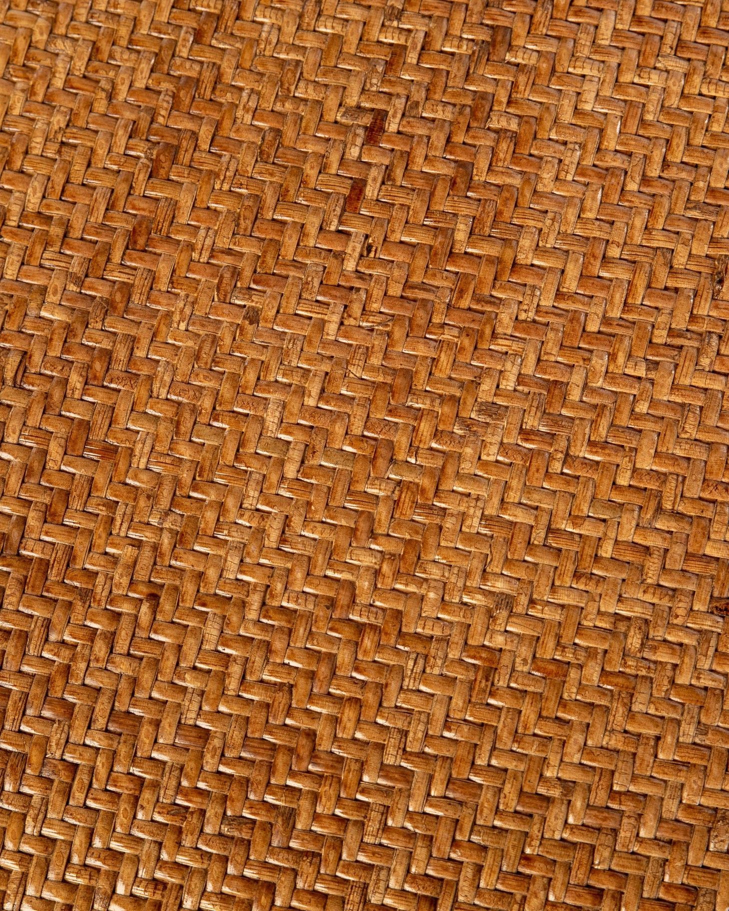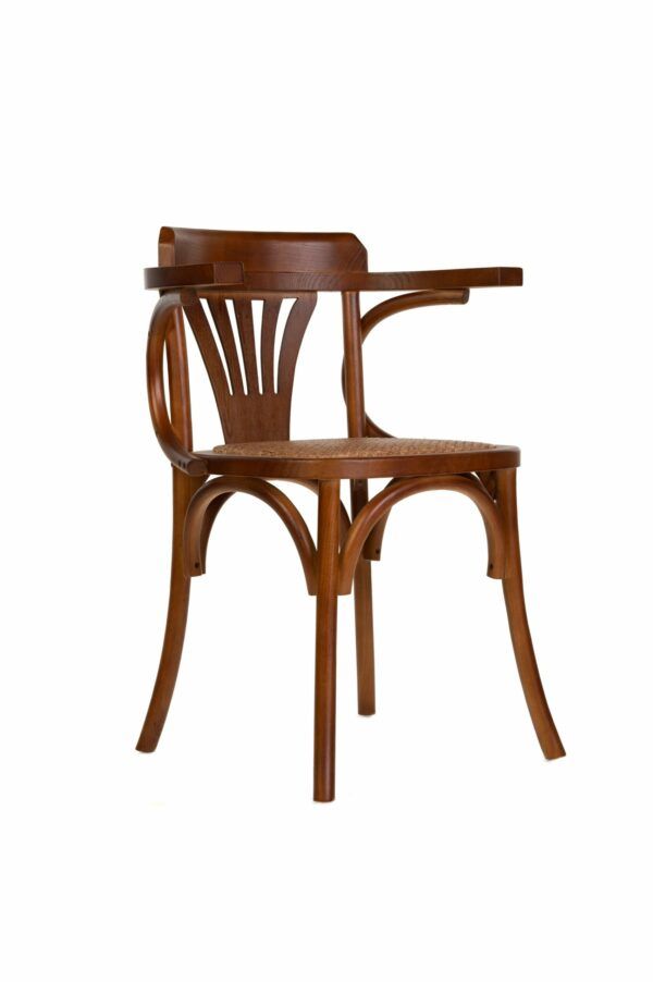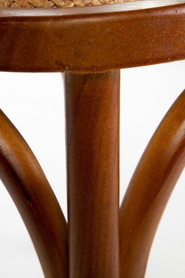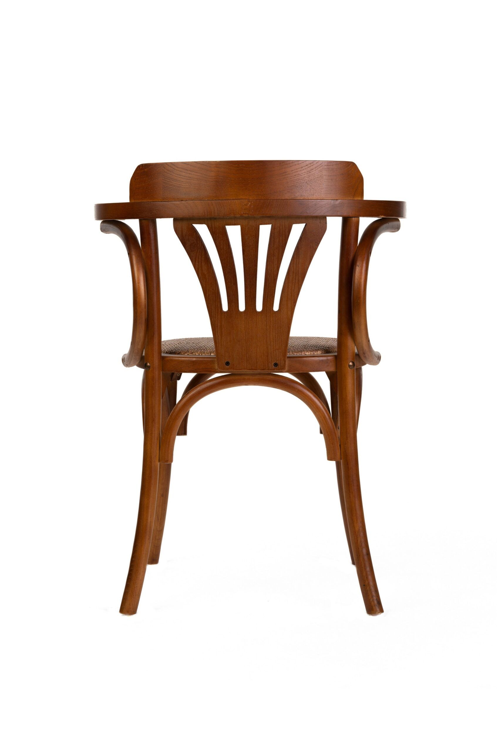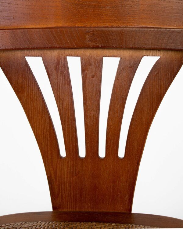Silla de madera de olmo con respaldo de madera con asiento de ratán tejido color marrón.