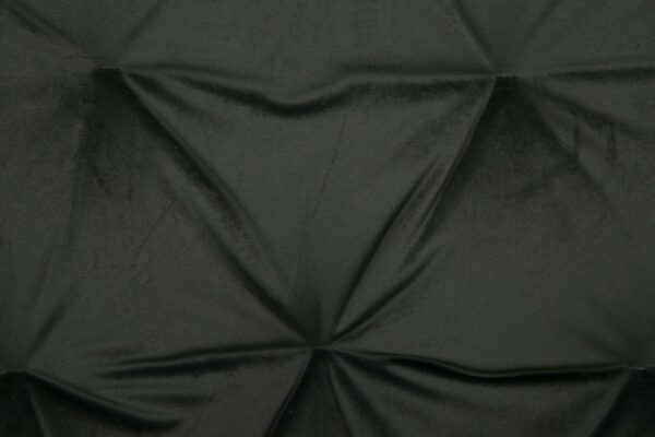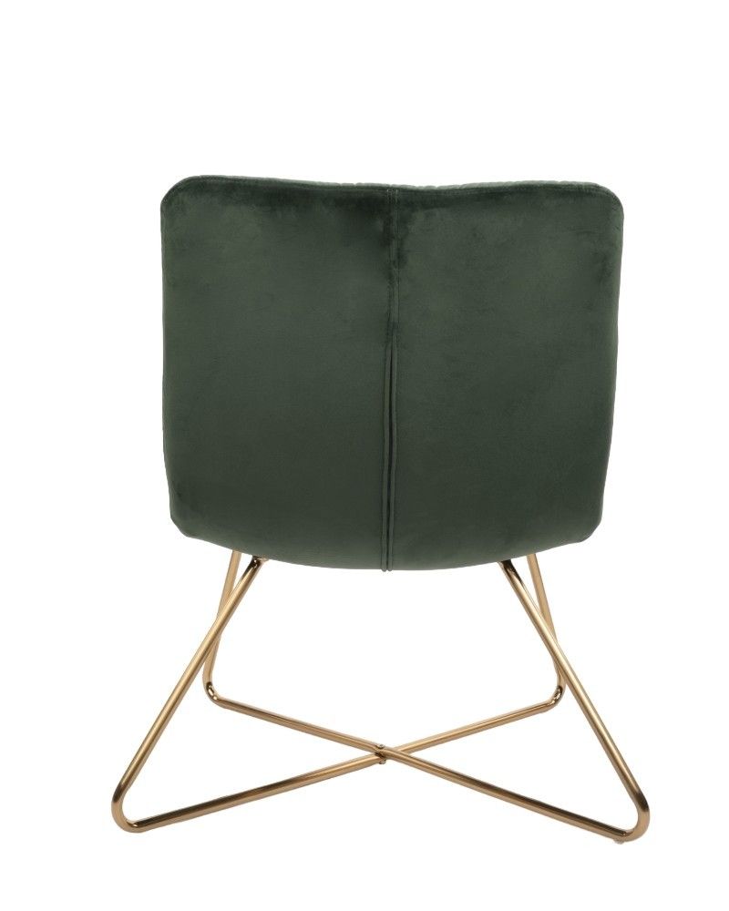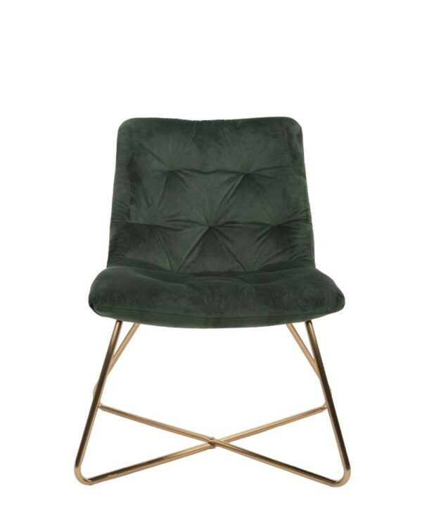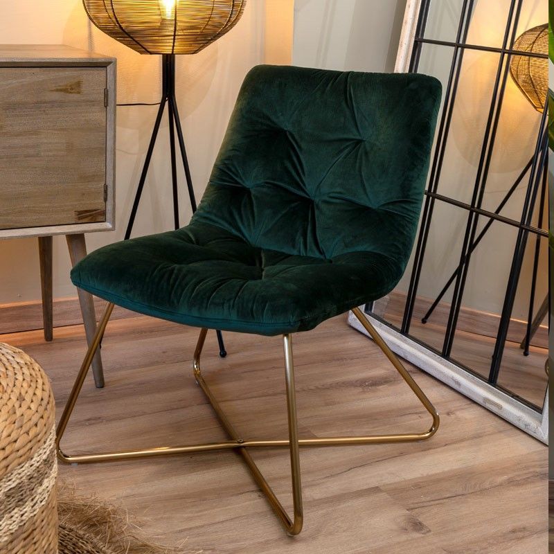 Silla baja con tapicería de terciopelo en estilo capitoné y patas de acero en color dorado.
