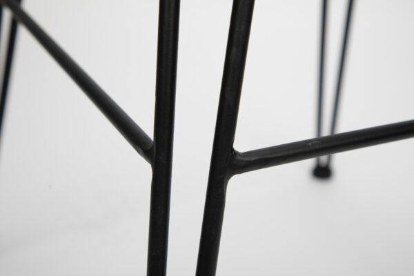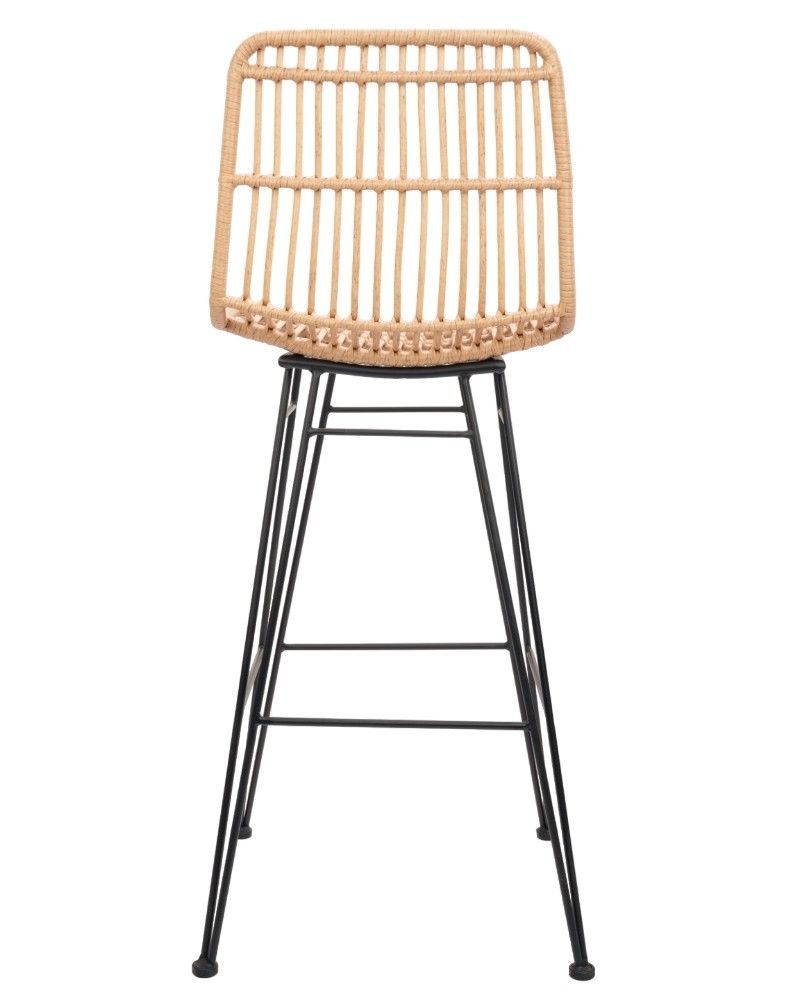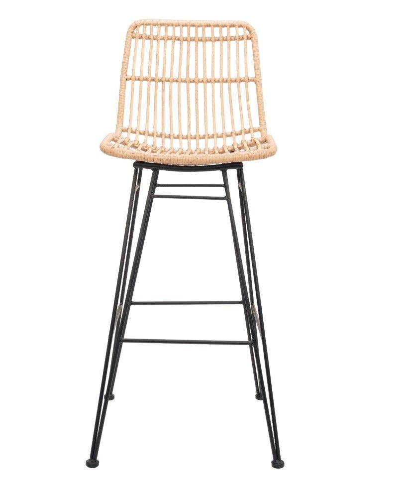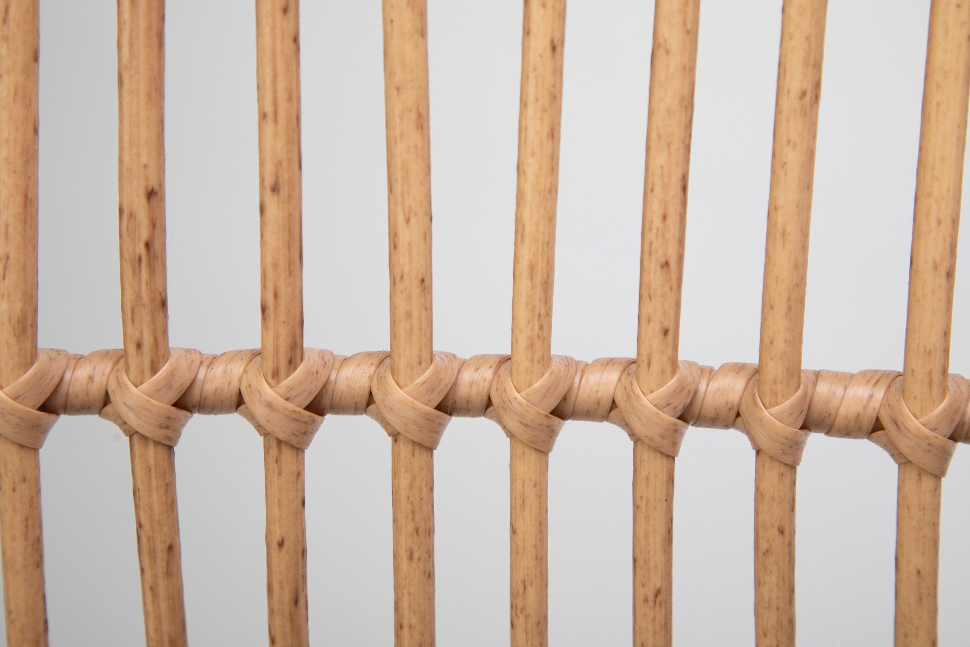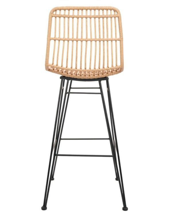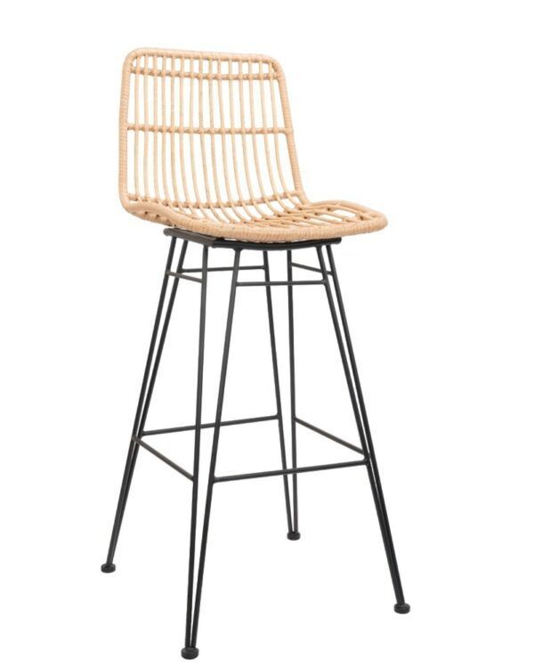 Esta silla está hecha de ratán artificial, lo cual hace de ella una silla muy versátil que puede usarse tanto para interior como para exterior, ya que al ser de PVC es totalmente resistente al agua. Las patas de la silla son de acero con acabado en pintura de polvo en negro mate.
