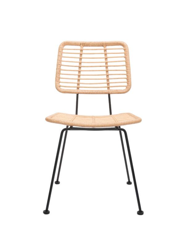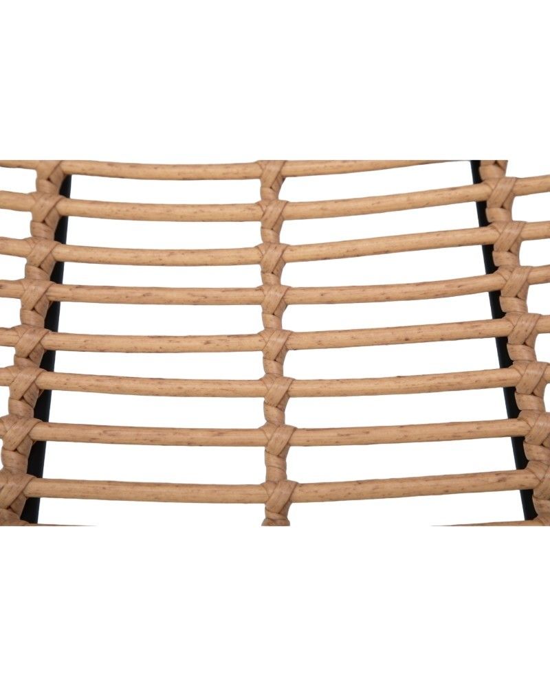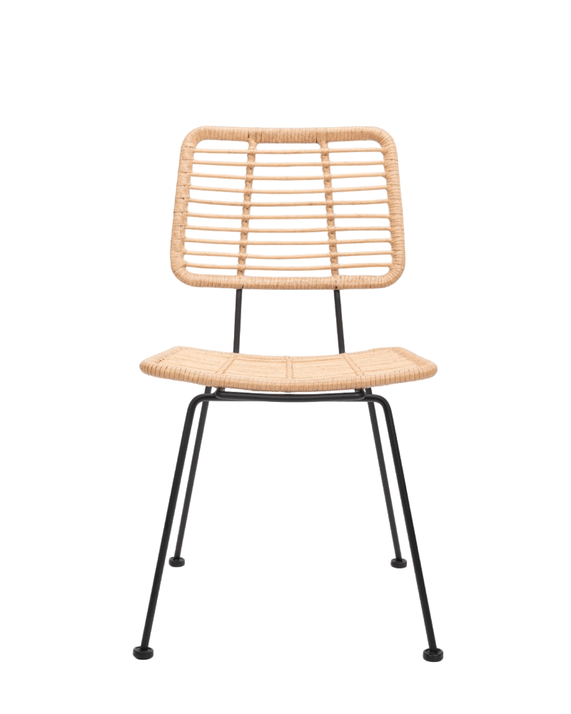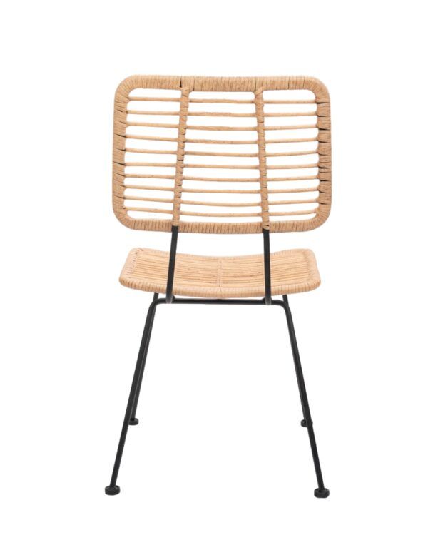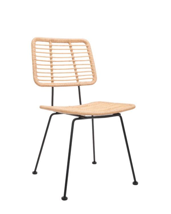 Esta silla está hecha de ratán artificial, lo cual hace de ella una silla muy versátil que puede usarse tanto para interior como para exterior. Al ser de PVC es totalmente resistente al agua. Las patas de la silla son de acero con acabado de pintura en polvo en negro mate.