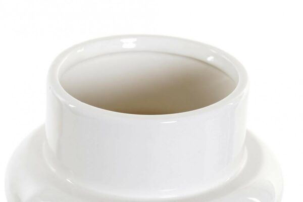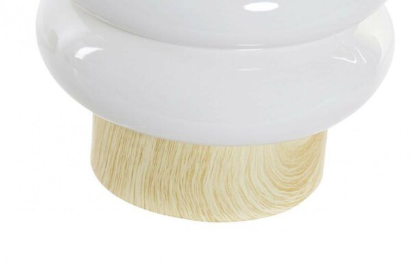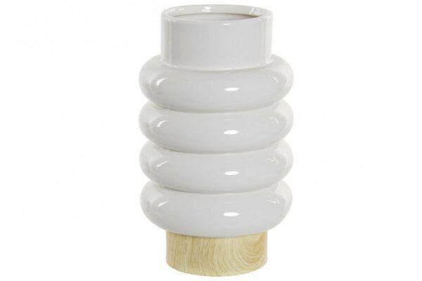 Jarrón de cerámica blanco con ondas y base imitación madera.