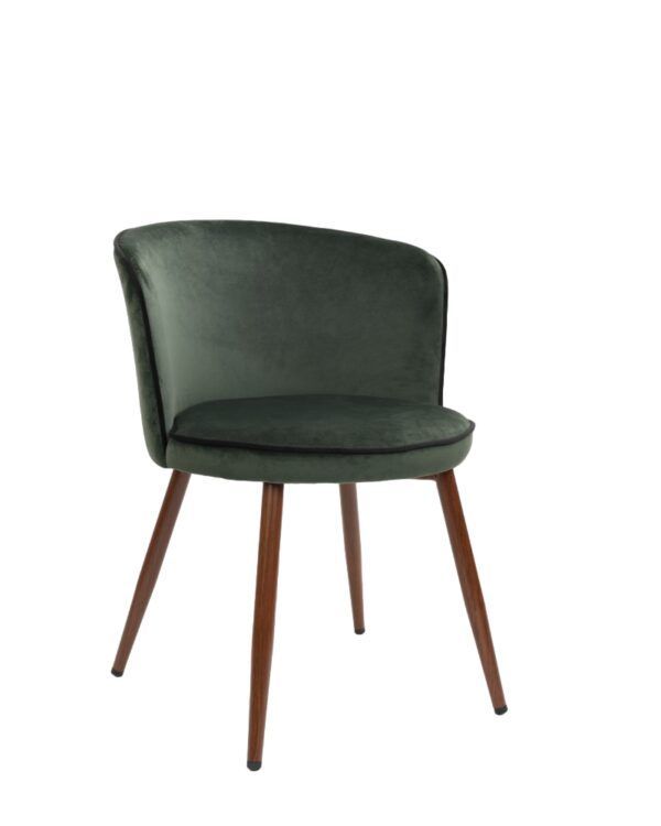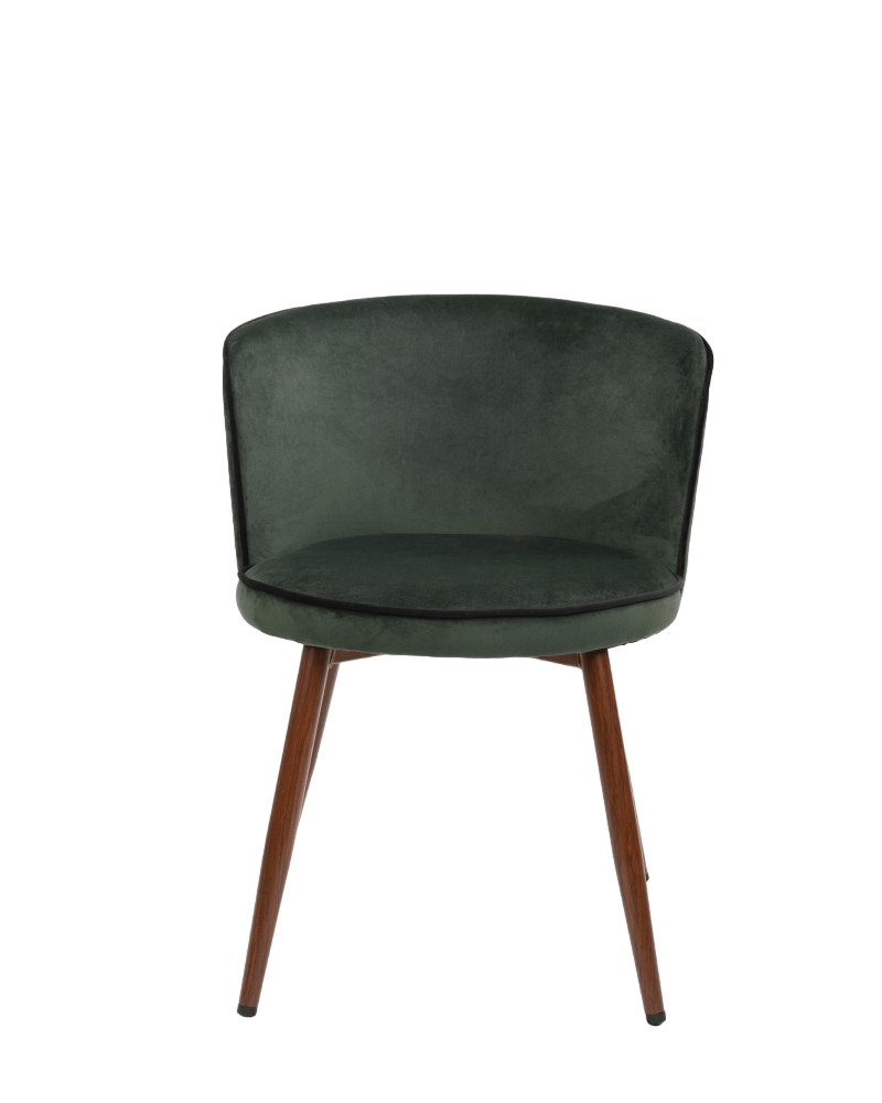 Silla comedor tapicería terciopelo con bordes color negro y patas de acero imitación madera.