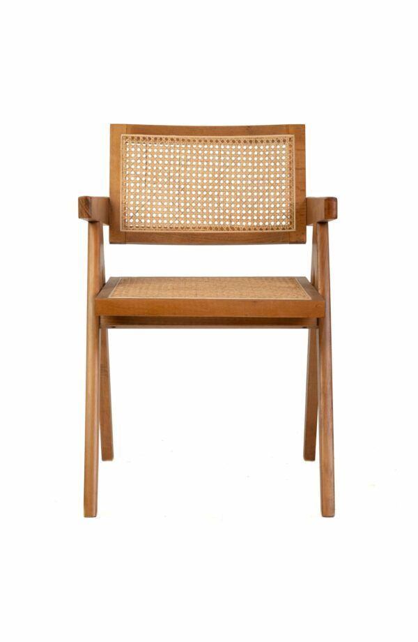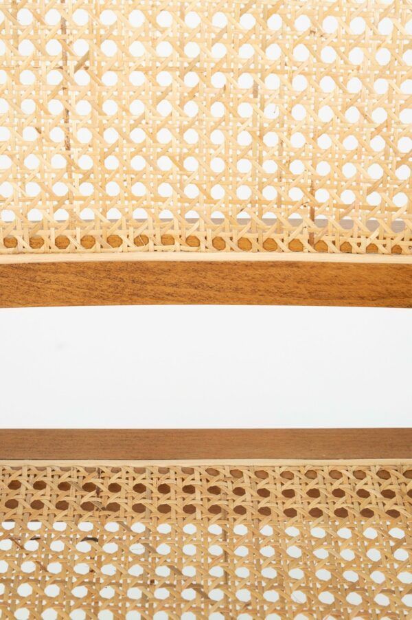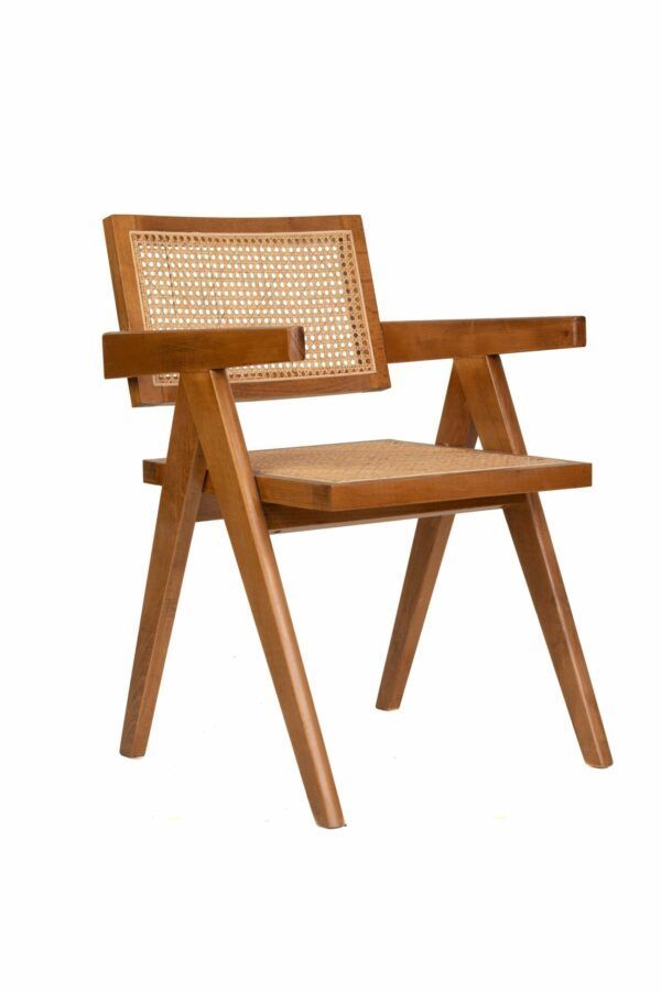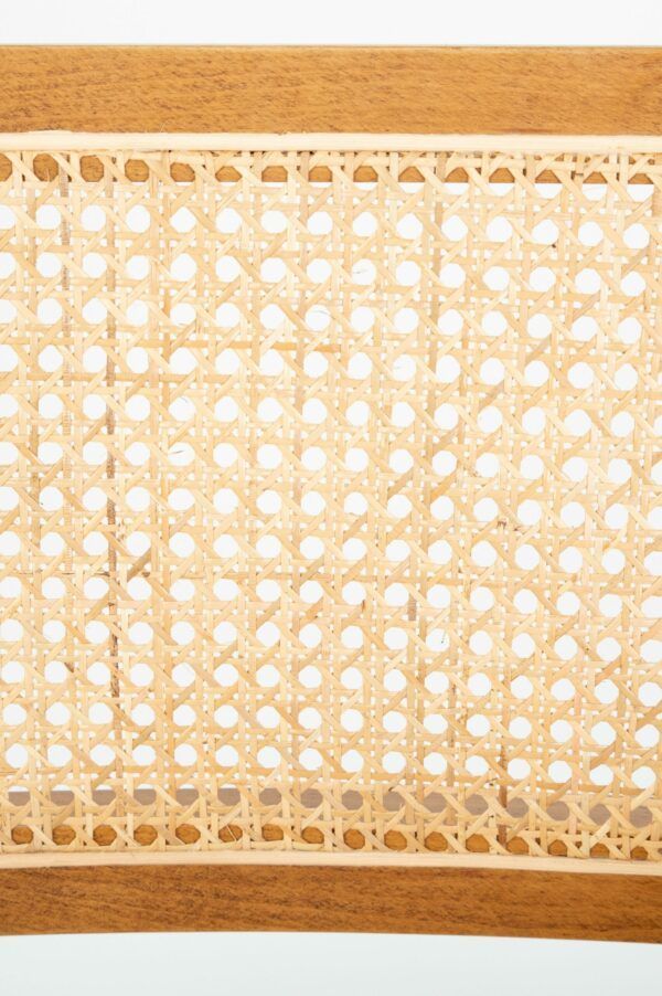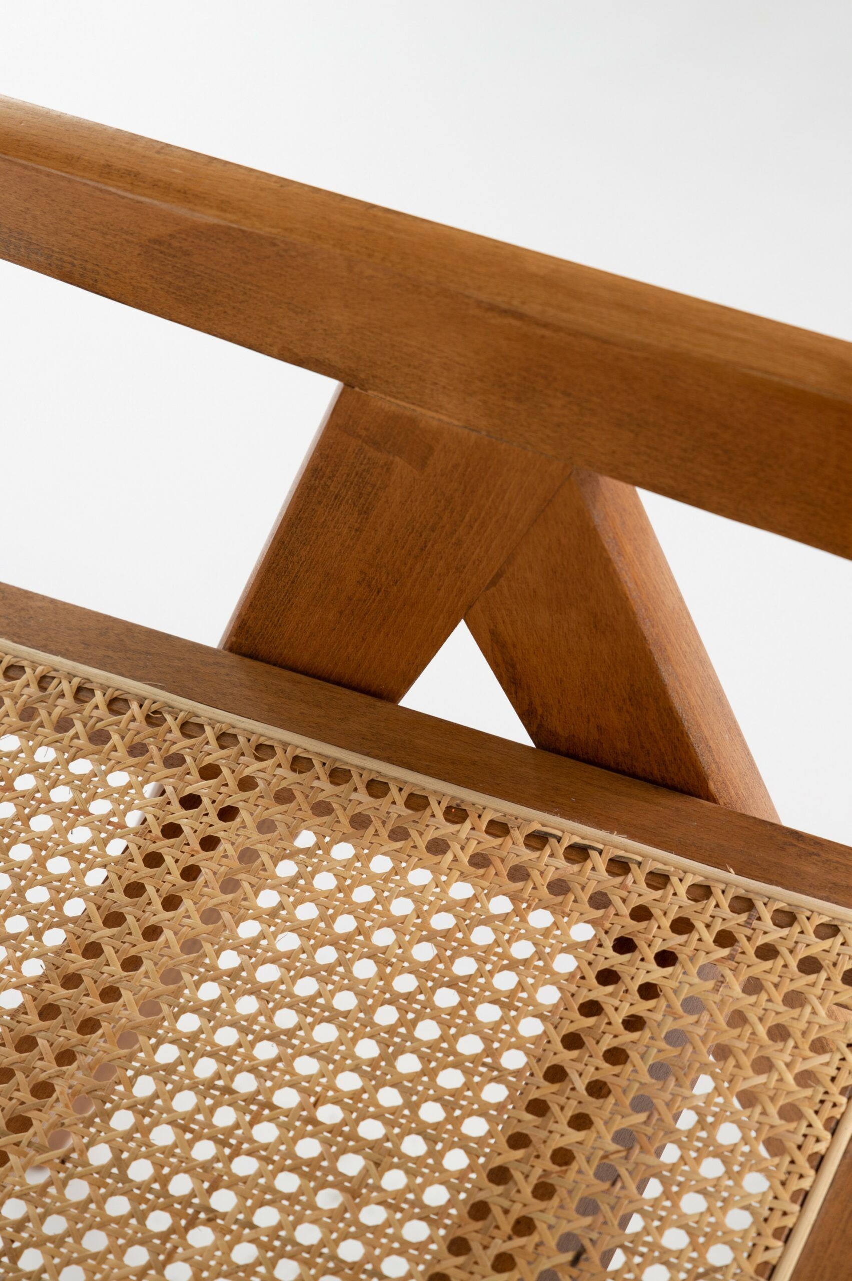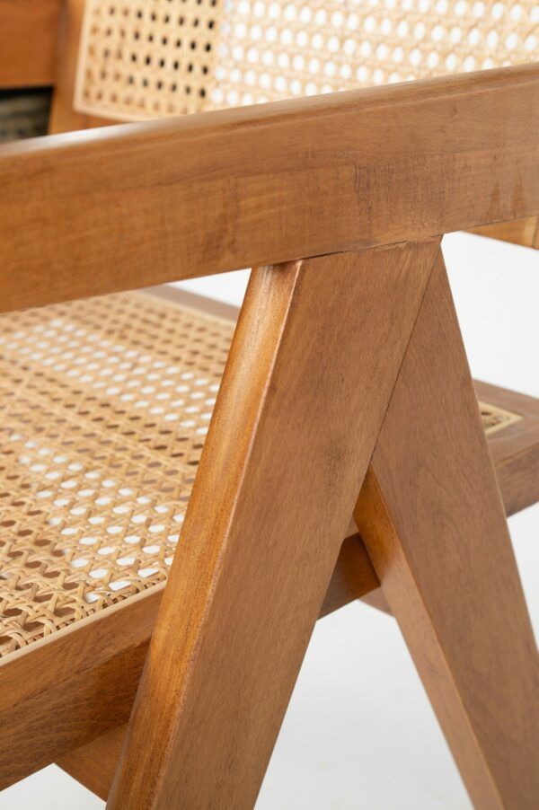 Sillón de madera de haya con asiento y respaldo de ratán, perfecto para interiores.