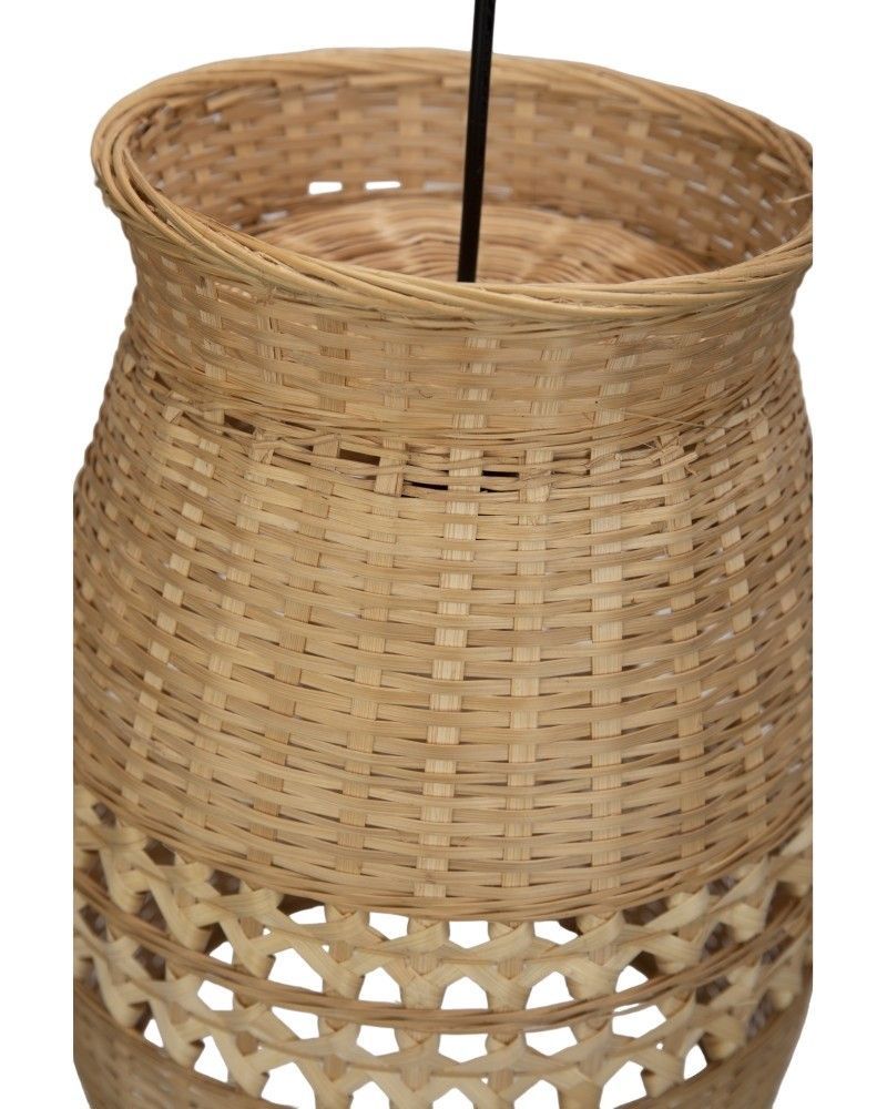 Lámpara de mimbre natural con forma alargada y diseño tejido en el centro.