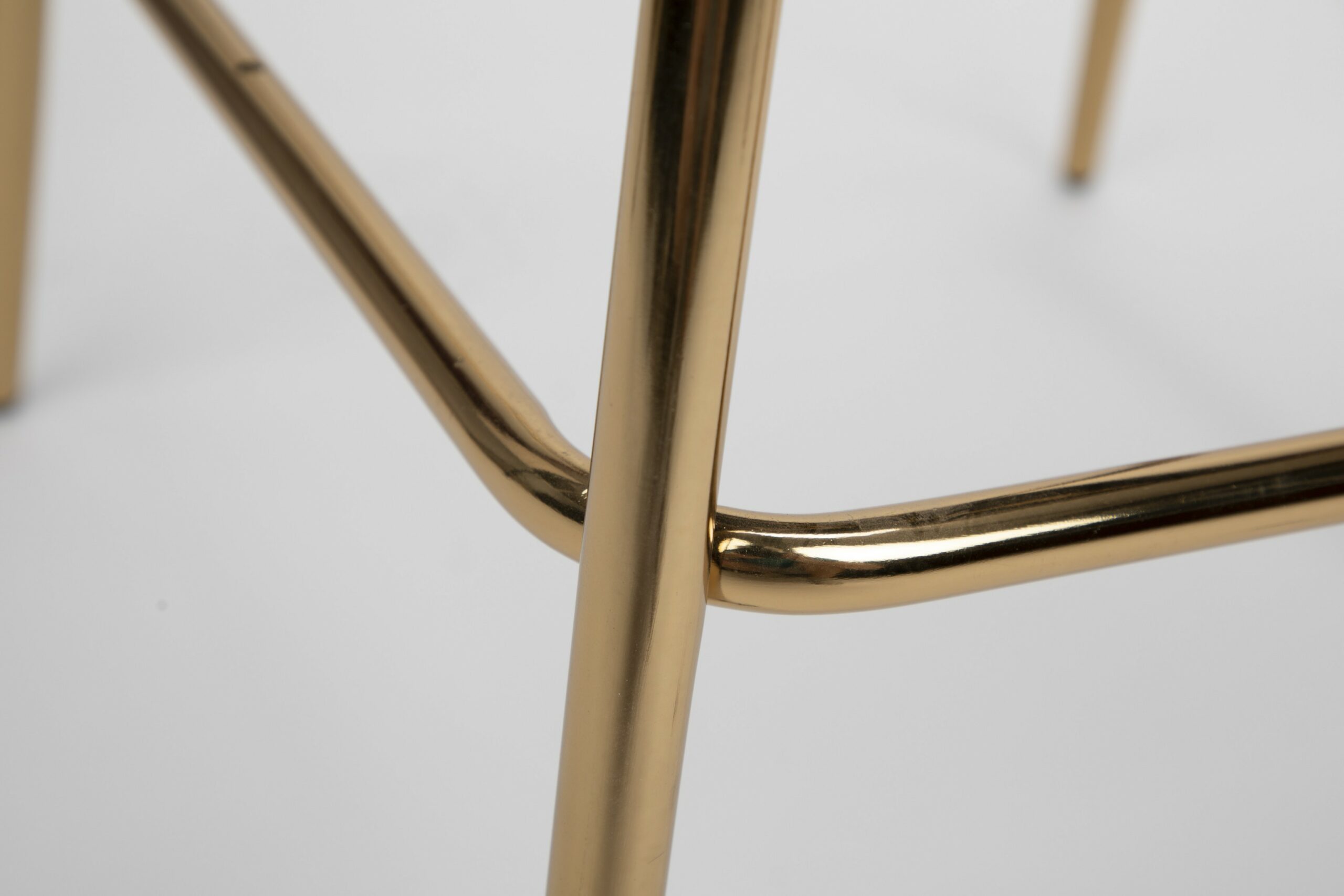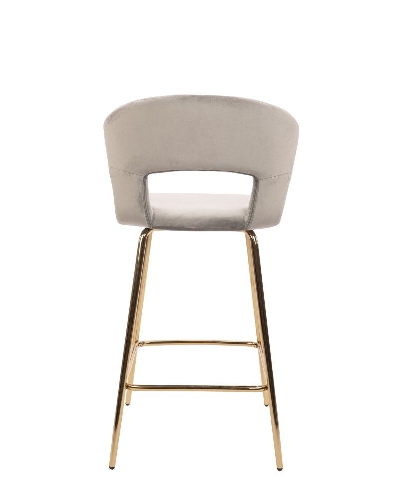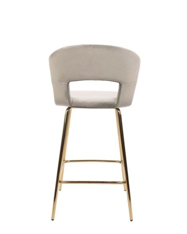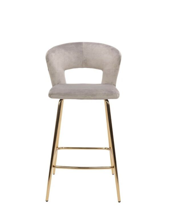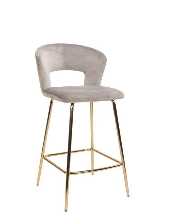 Taburete alto tapicería terciopelo color gris, patas y reposapiés de acero en dorado.
