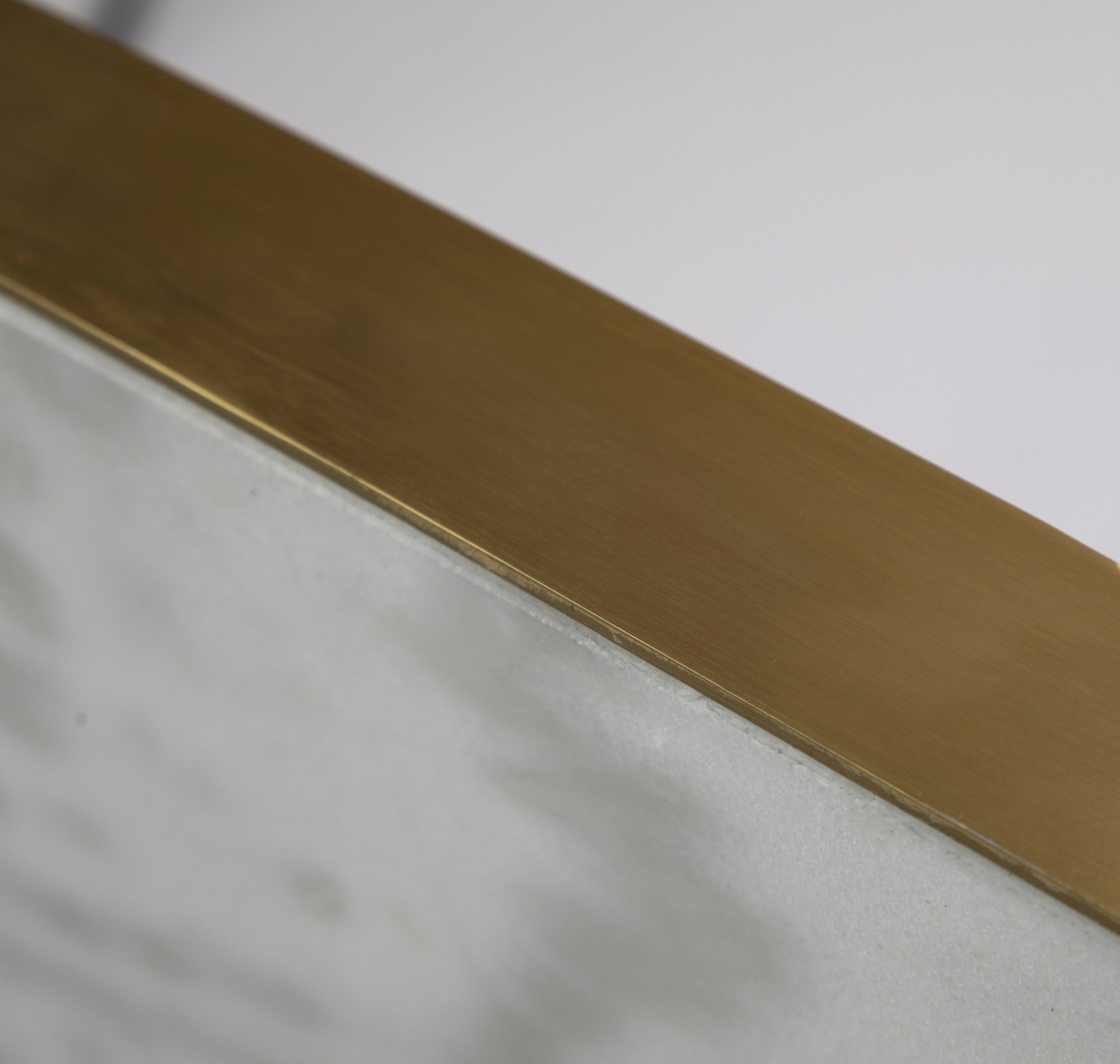 Tapa de mármol natural blanco con vetas en gris. Lleva el borde de metal dorado totalmente adherido a la piedra.