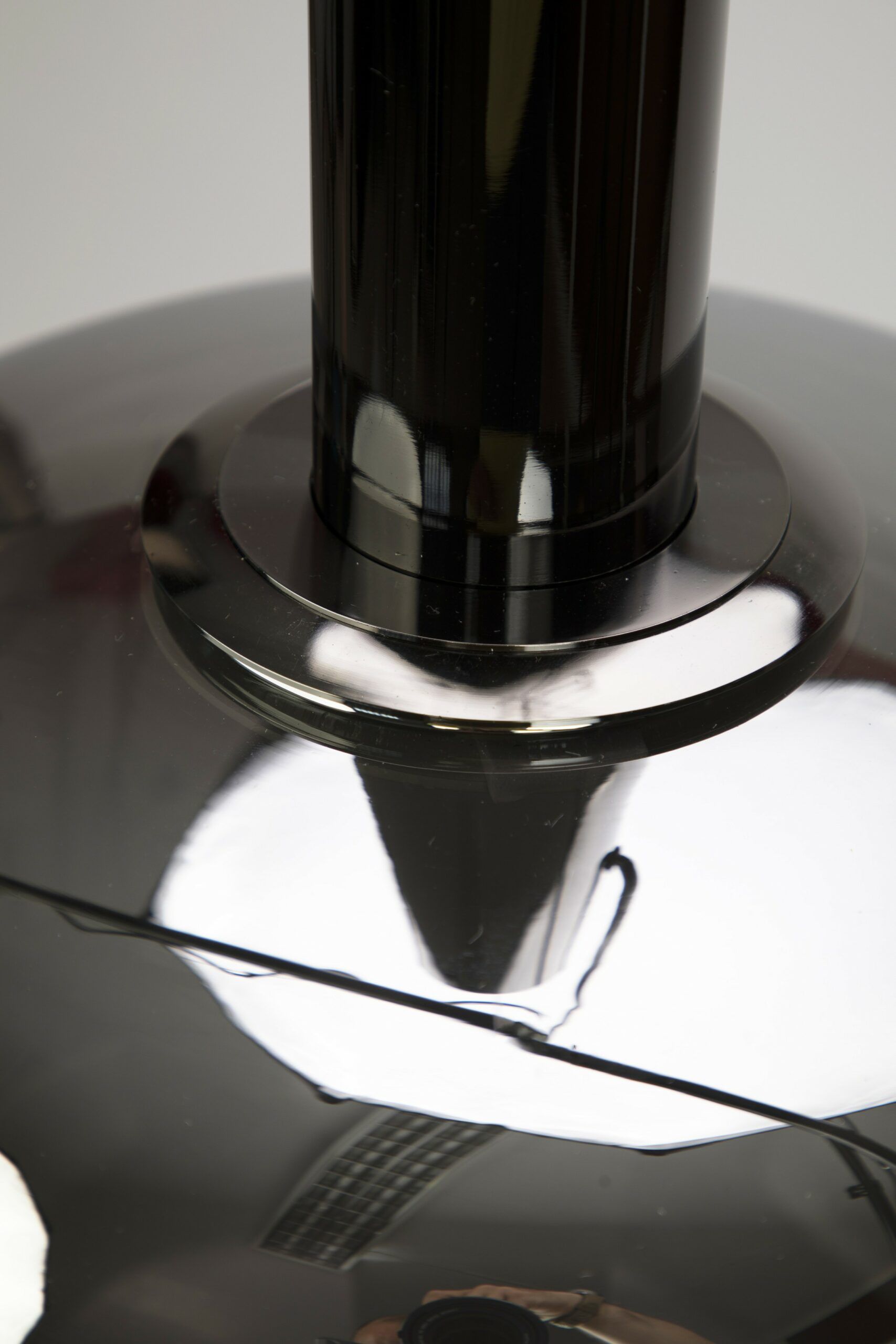 Lámpara de techo con cristal reflectante y estructura metálica. Tanto la estructura como el cristal tienen un acabado reflectante, sin embargo, cuando se enciende es translúcida.