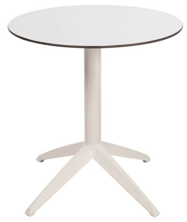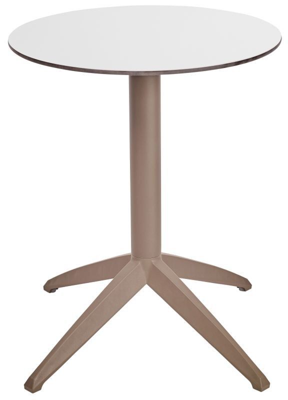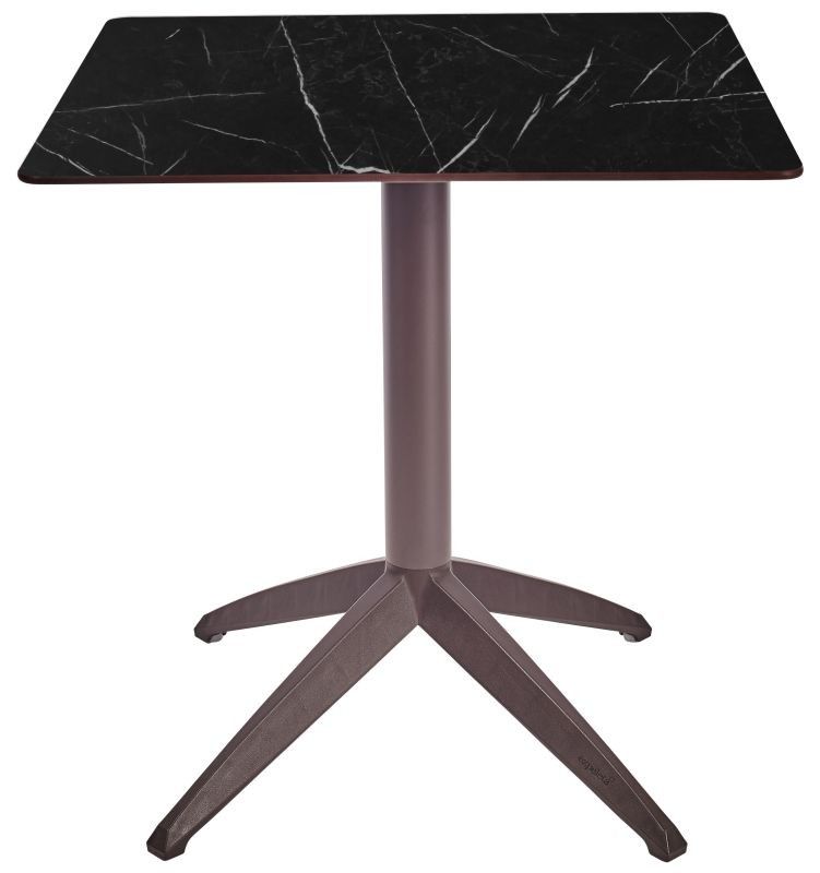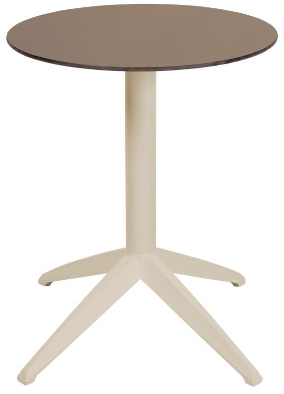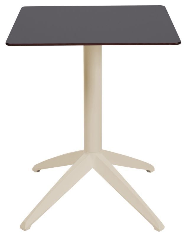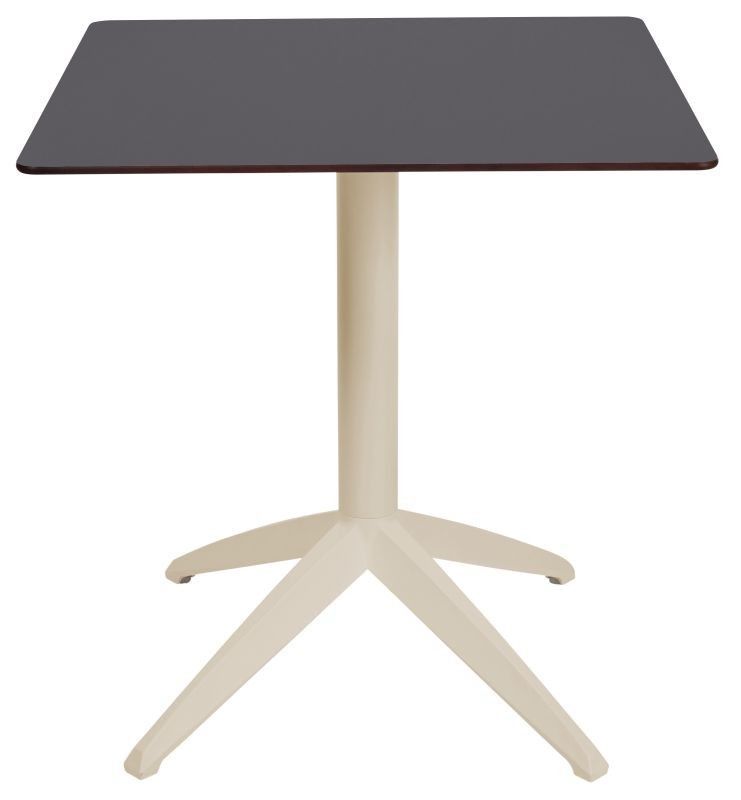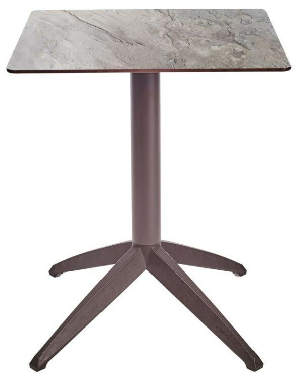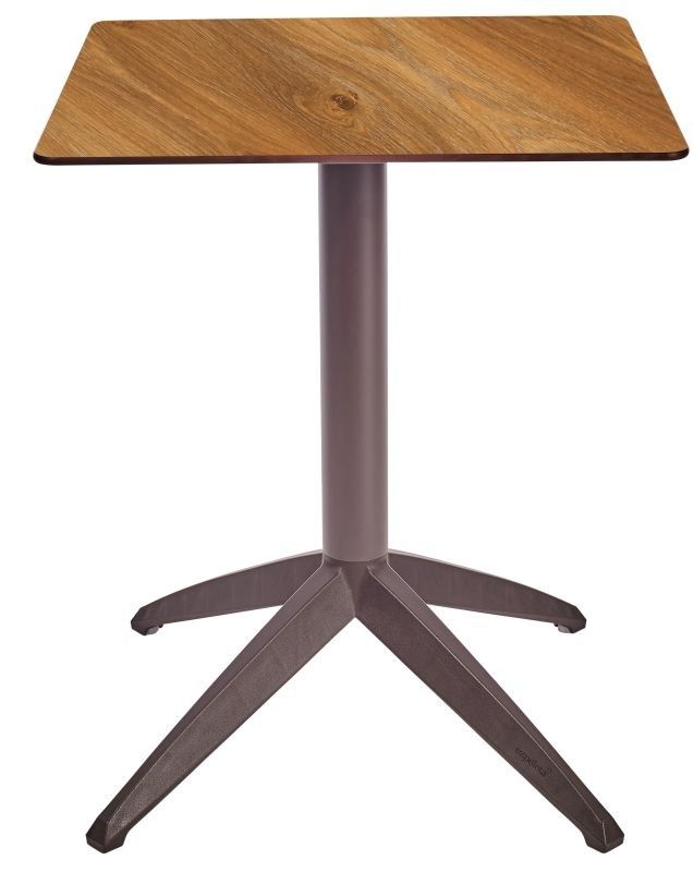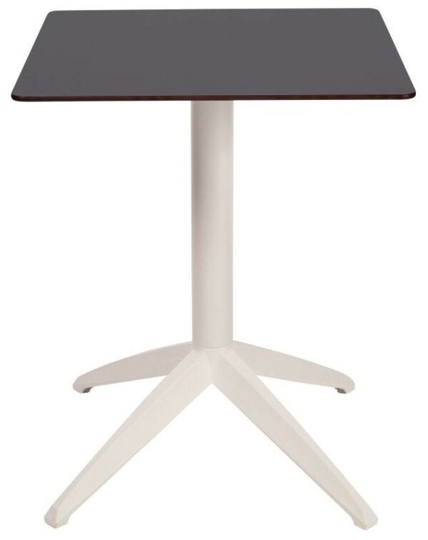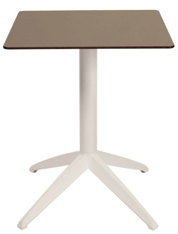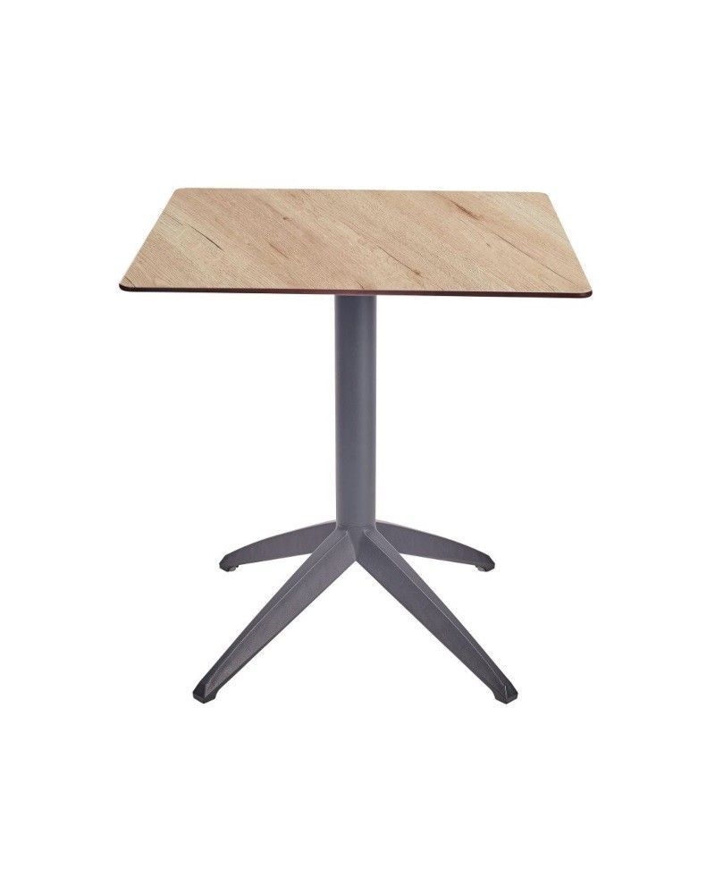 Mesa abatible para interiores y exteriores con tablero compacto y estructura de aluminio lacado.