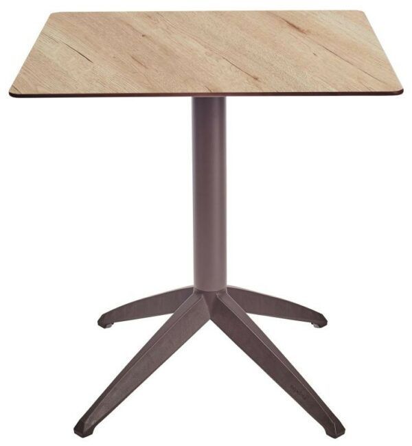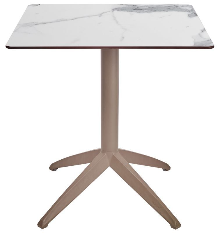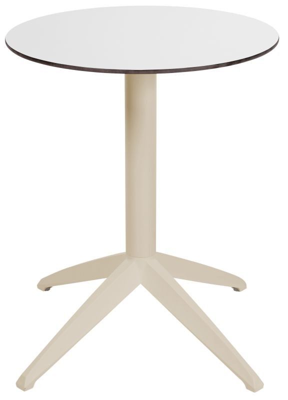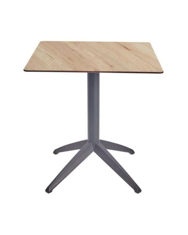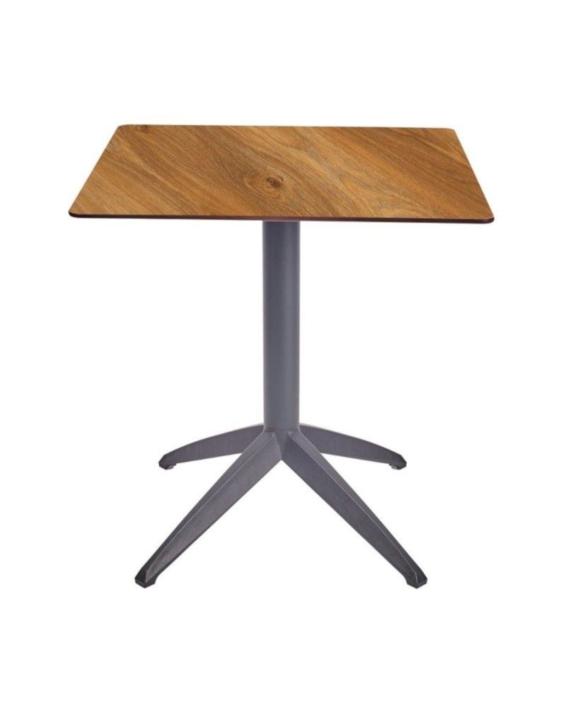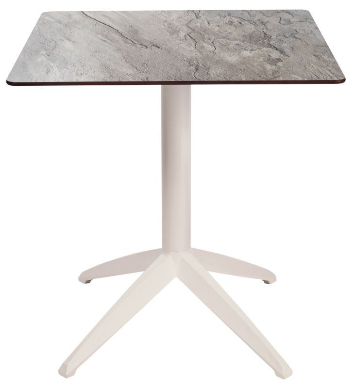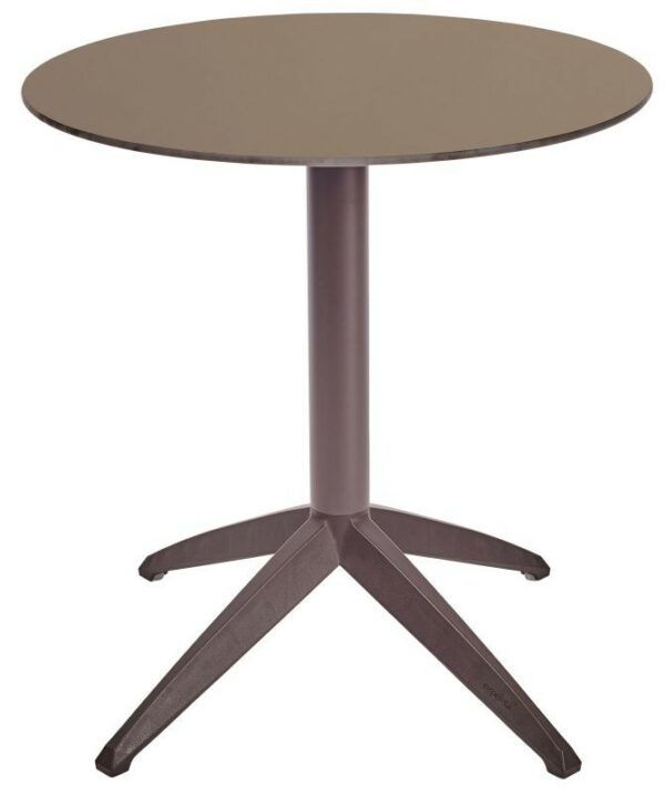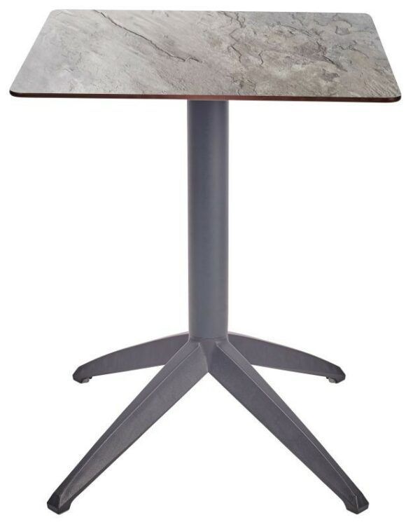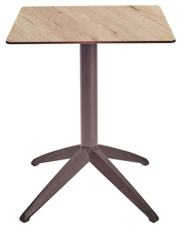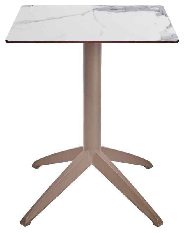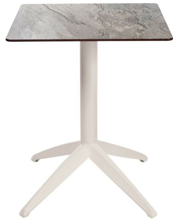 Mesa abatible para interiores y exteriores con tablero compacto y estructura de aluminio lacado.