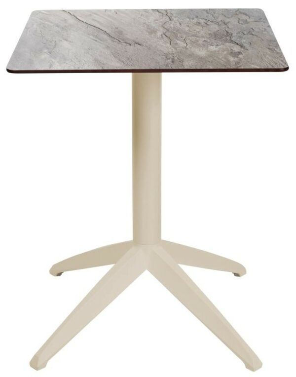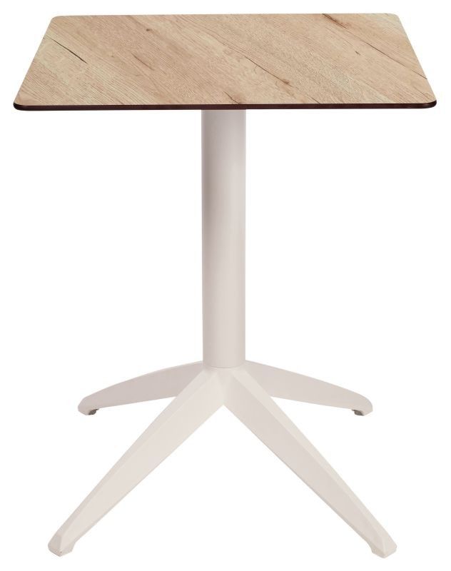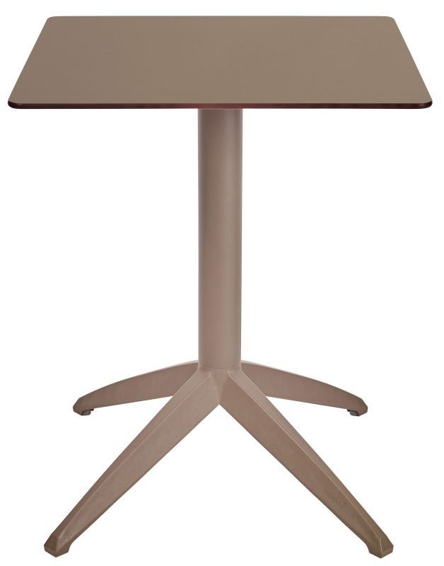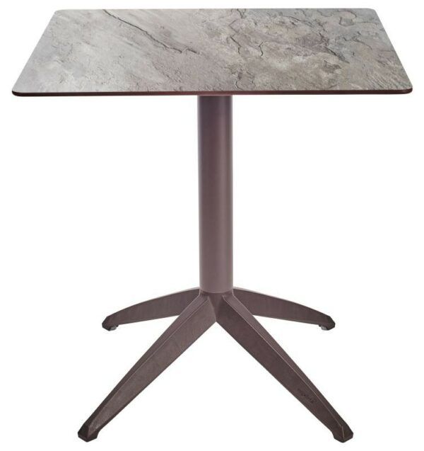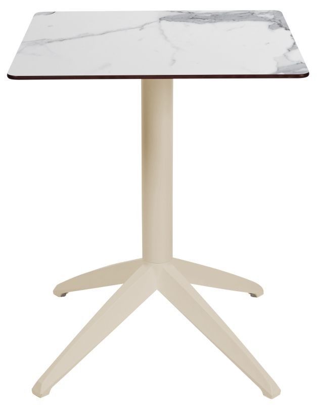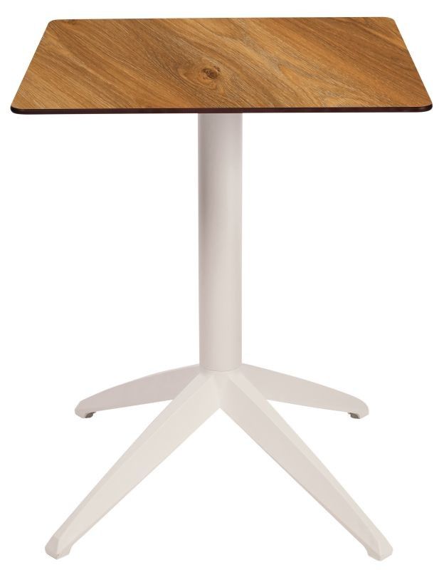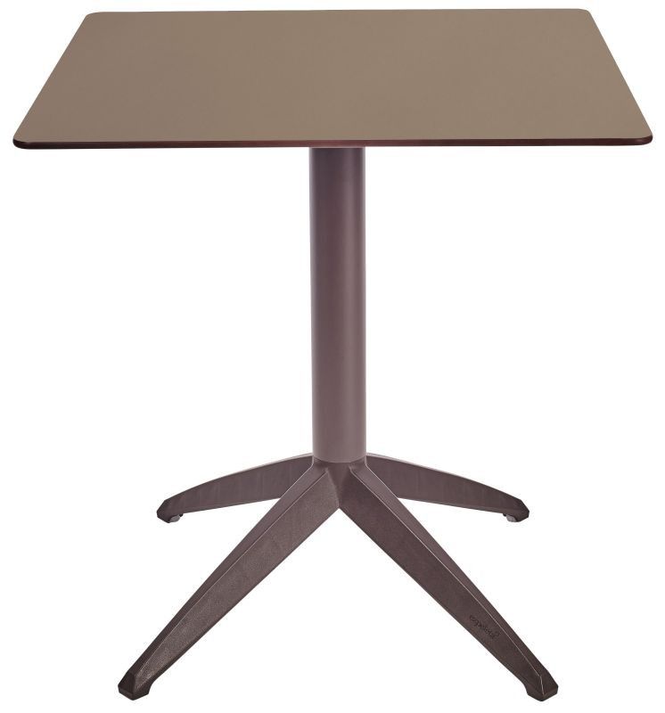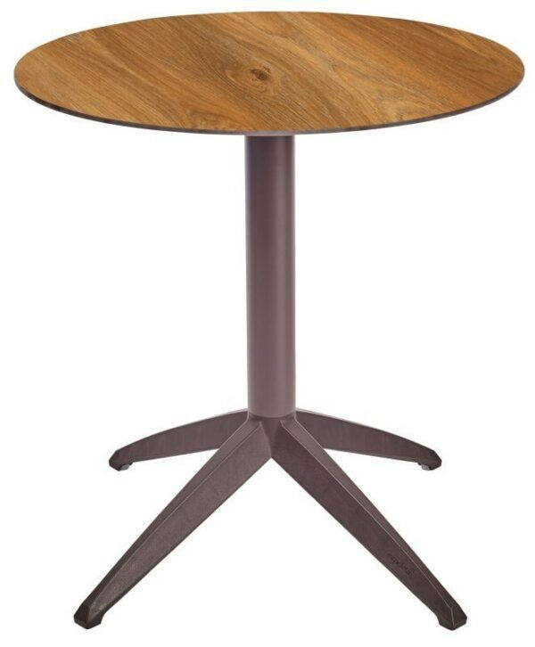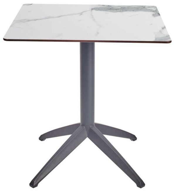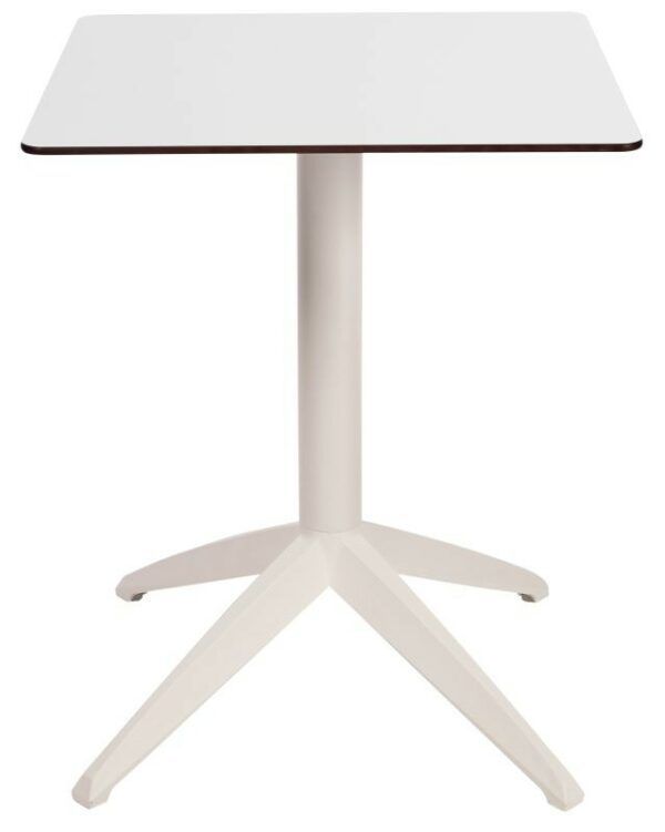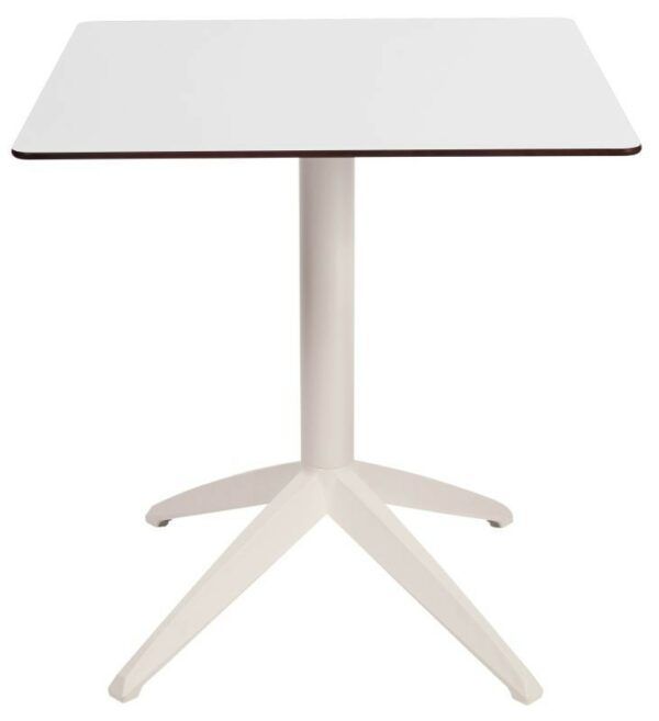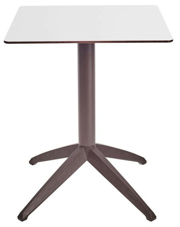 Mesa abatible para interiores y exteriores con tablero compacto y estructura de aluminio lacado.