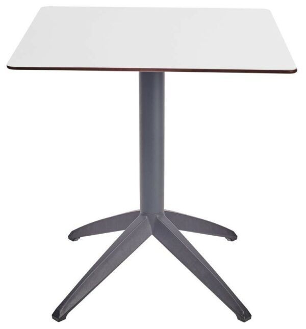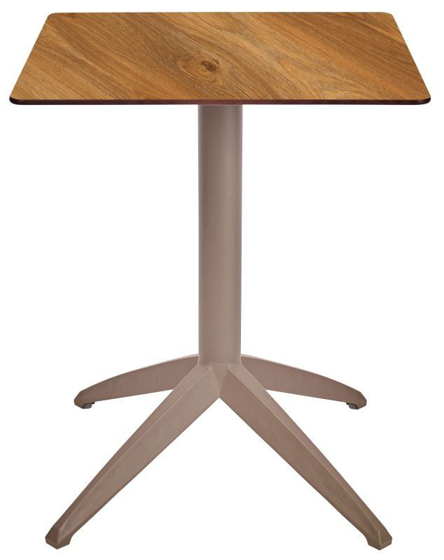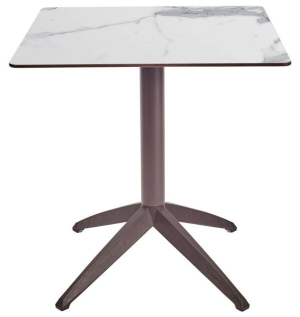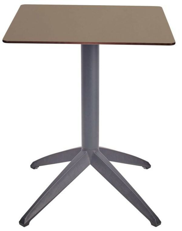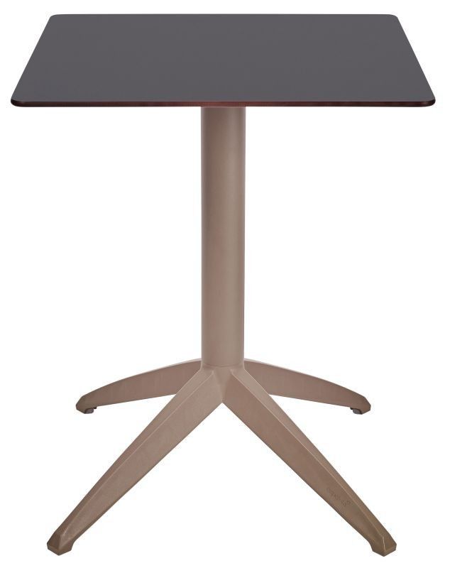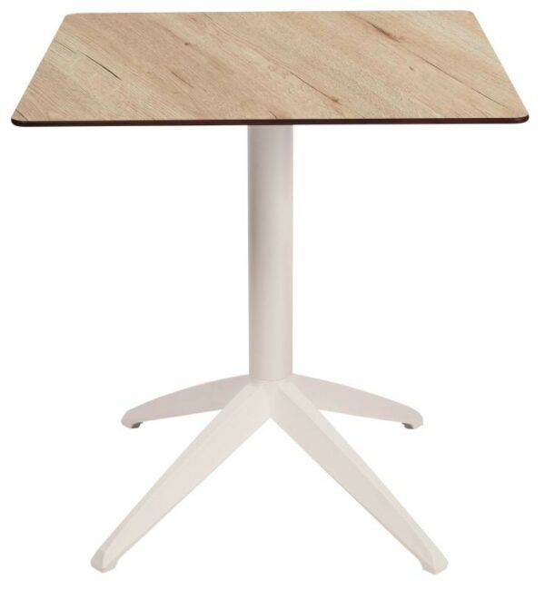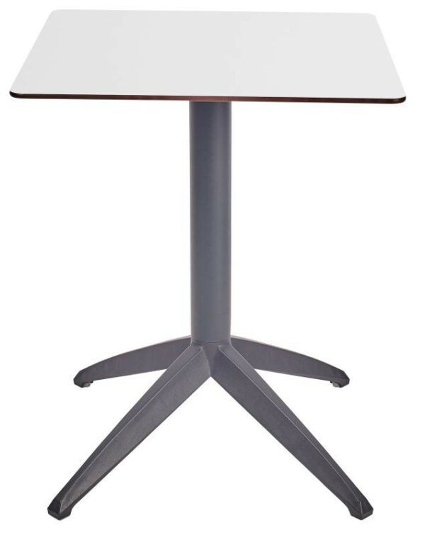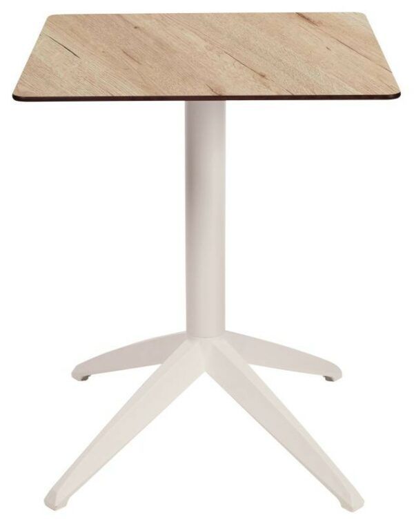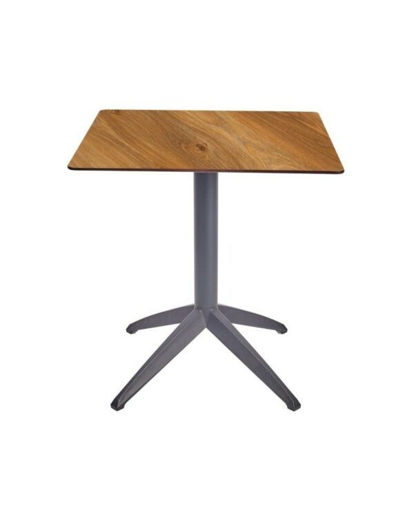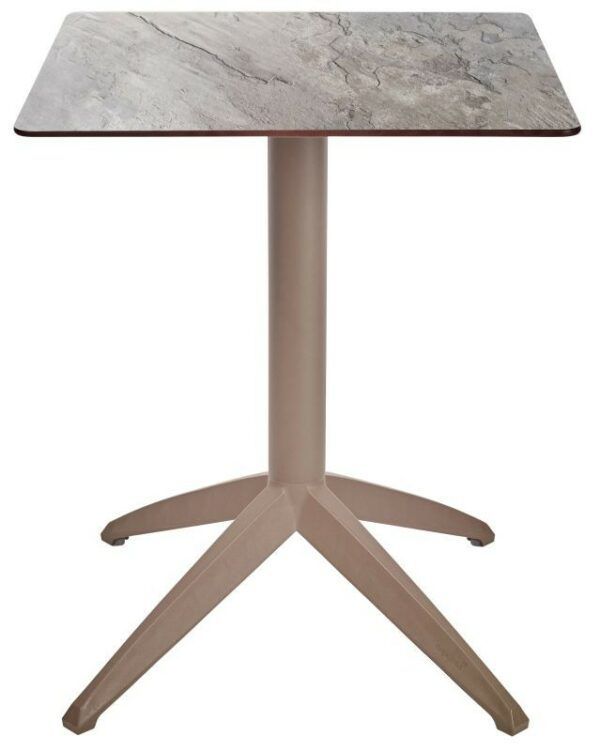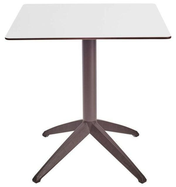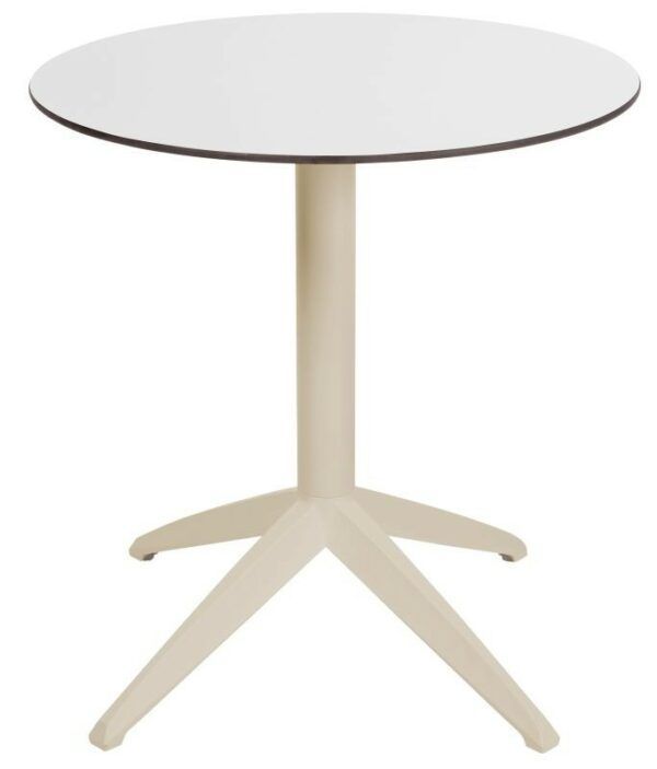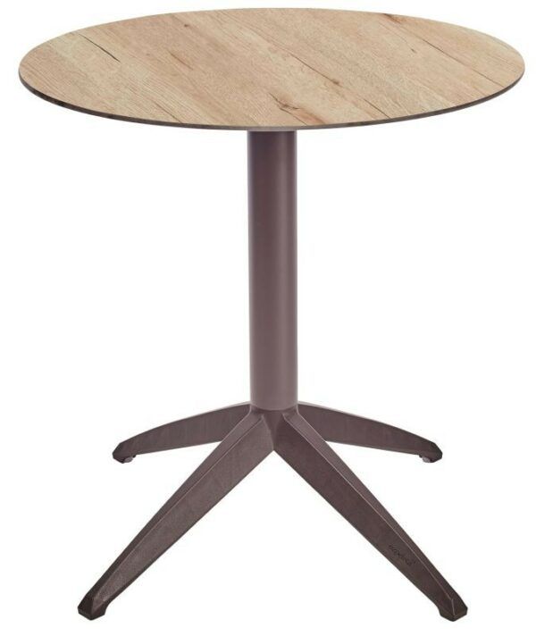 Mesa abatible para interiores y exteriores con tablero compacto y estructura de aluminio lacado.