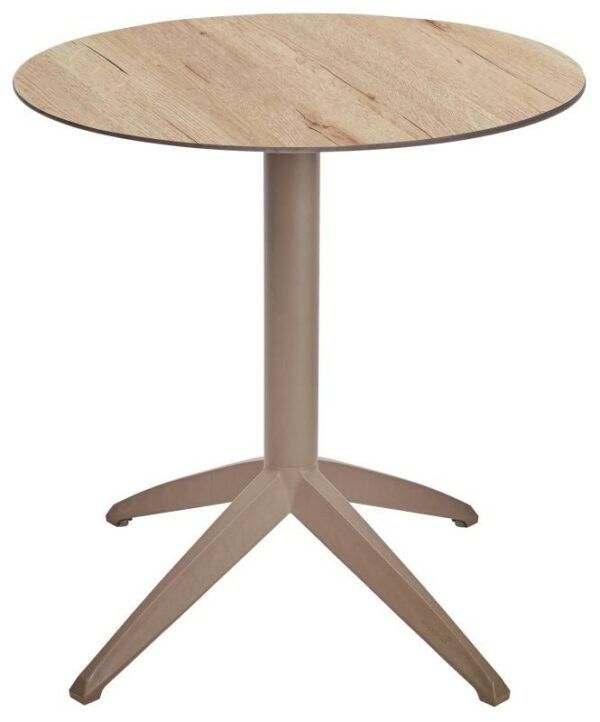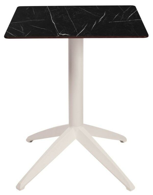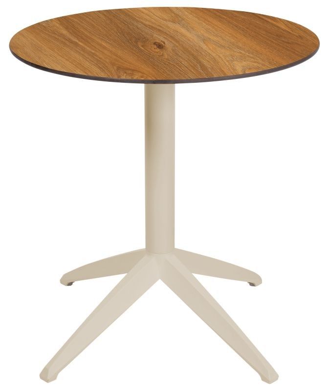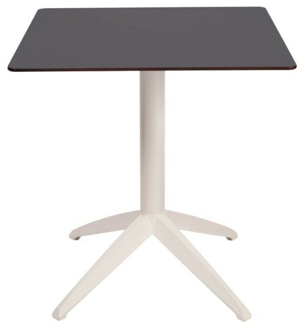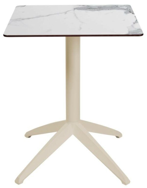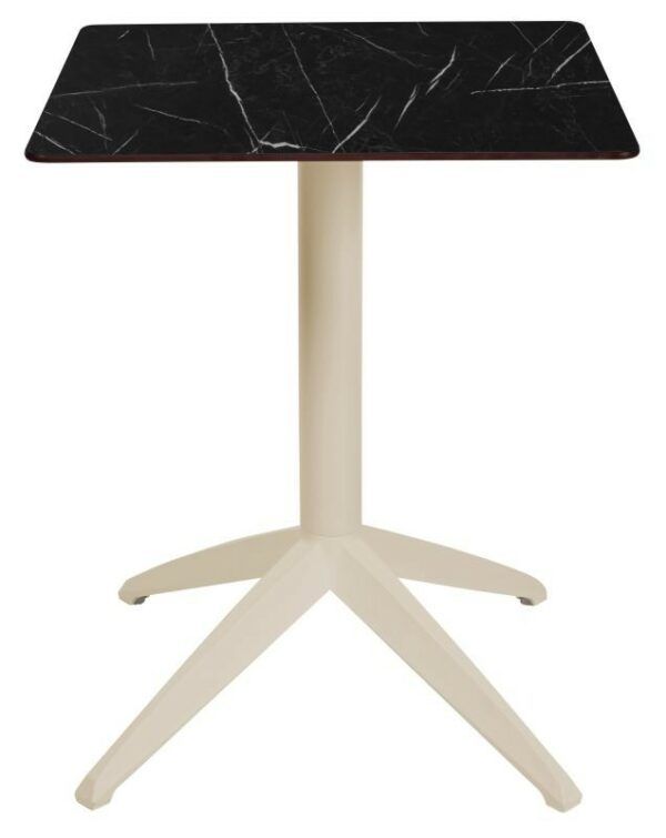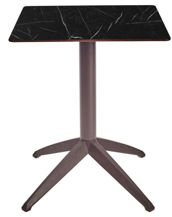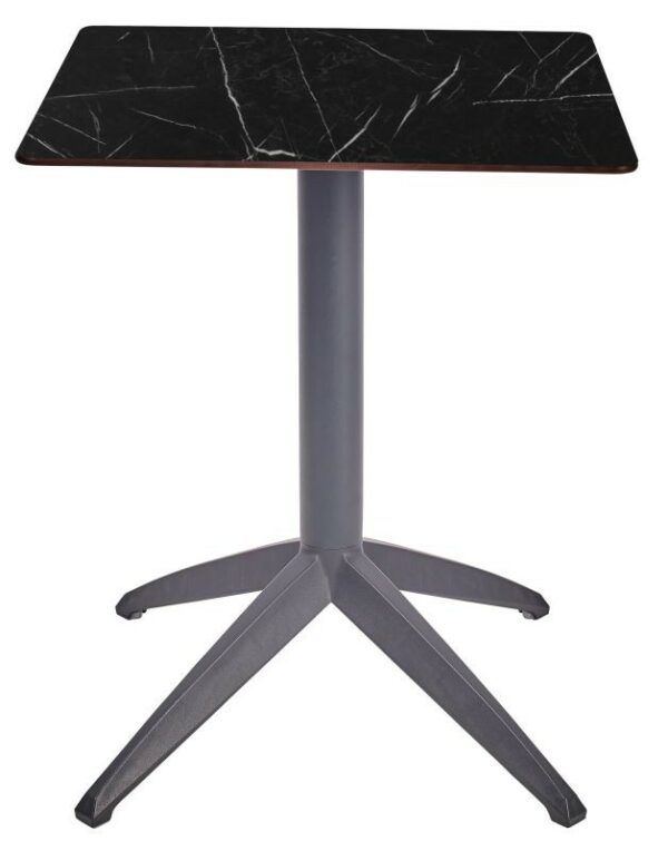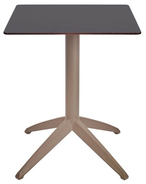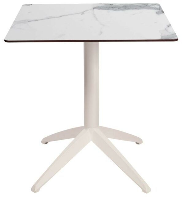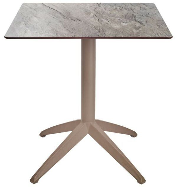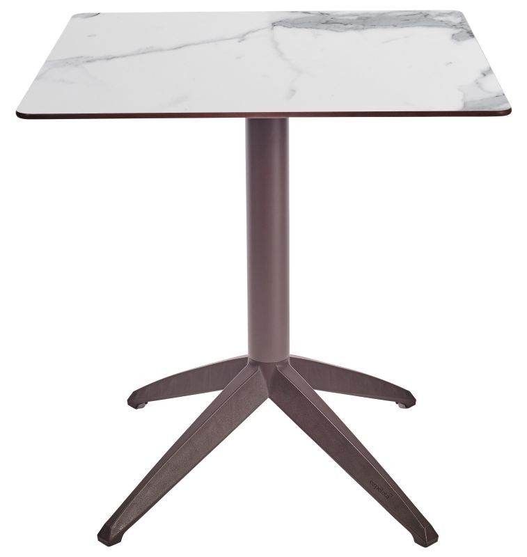 Mesa abatible para interiores y exteriores con tablero compacto y estructura de aluminio lacado.