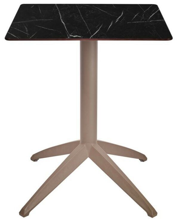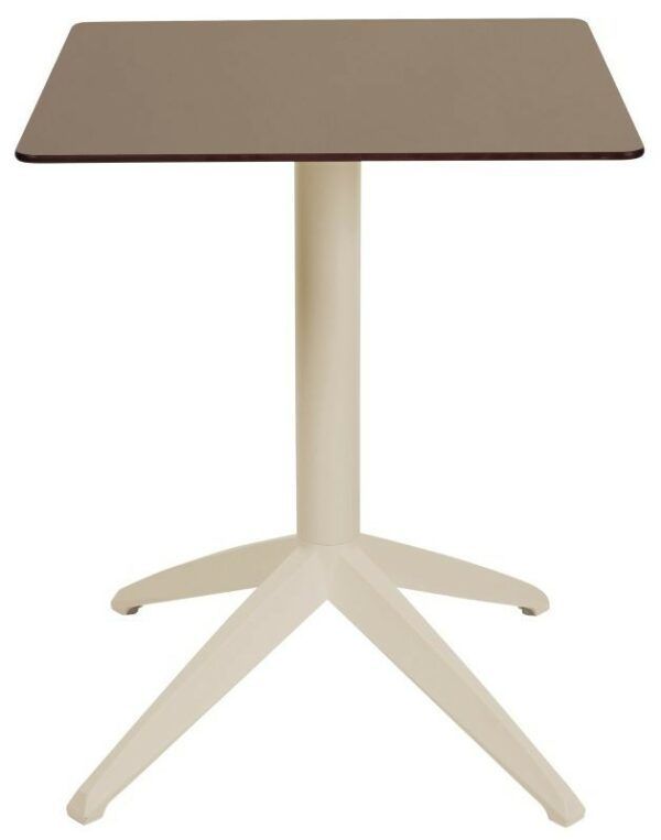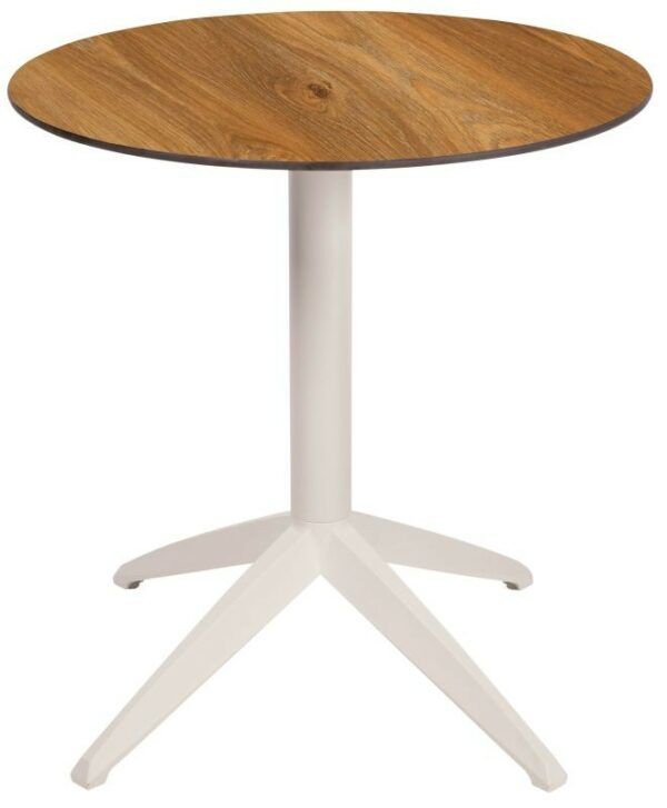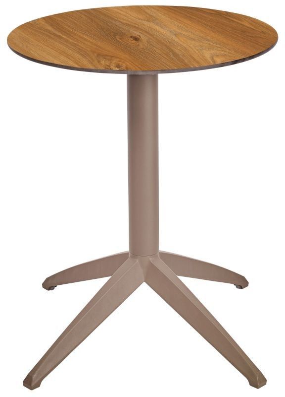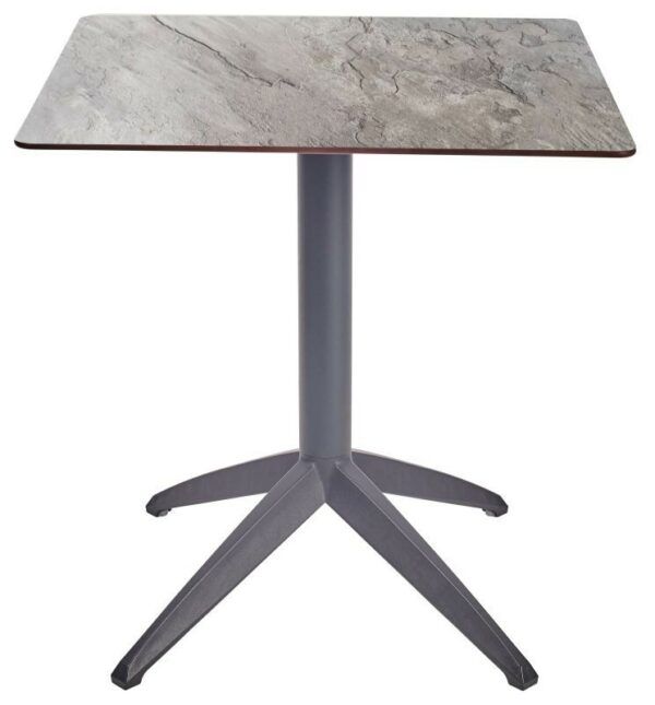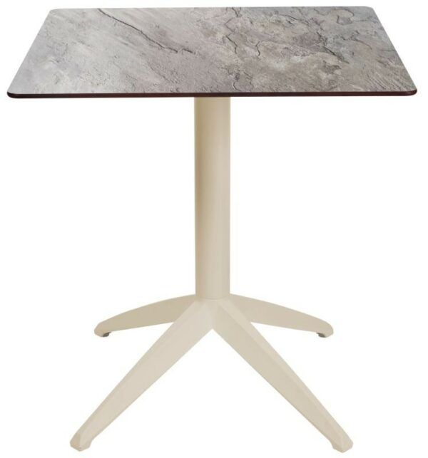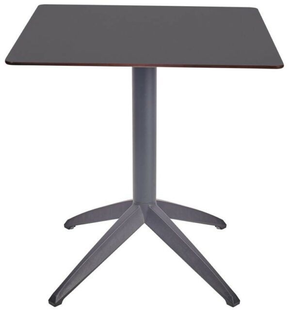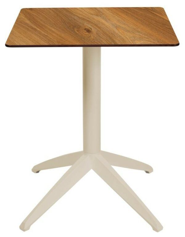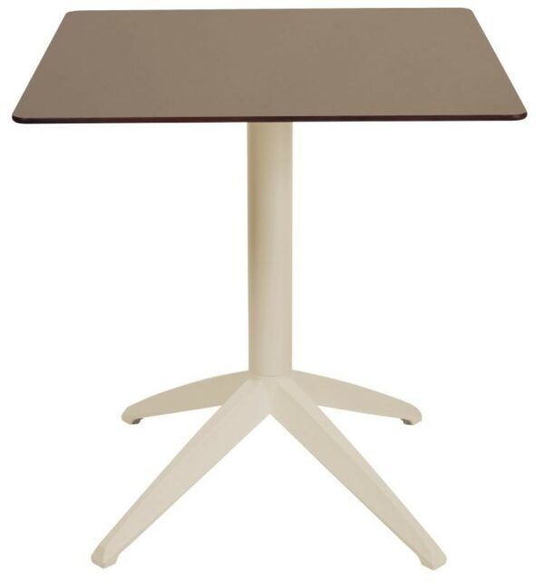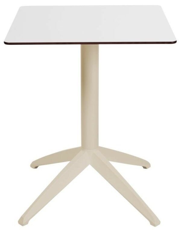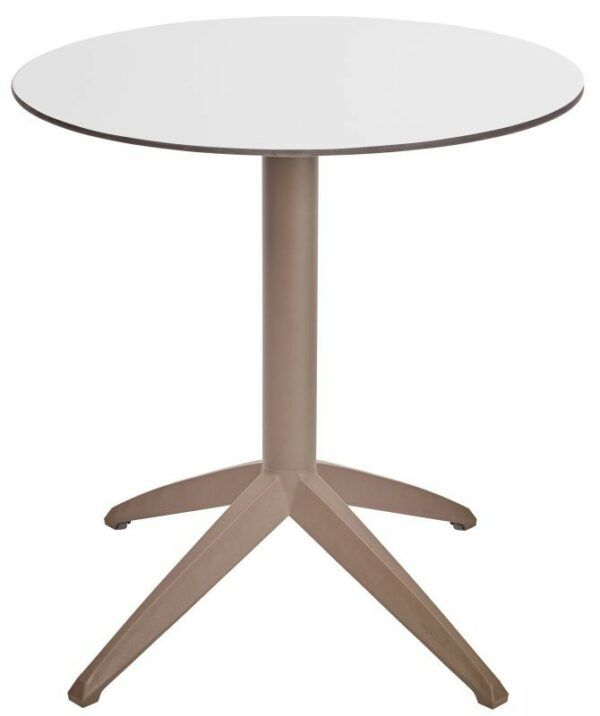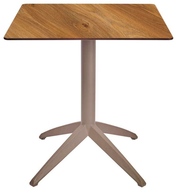 Mesa abatible para interiores y exteriores con tablero compacto y estructura de aluminio lacado.