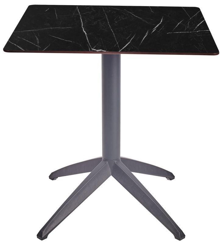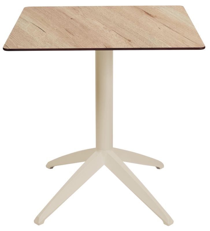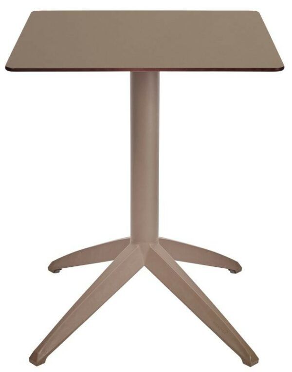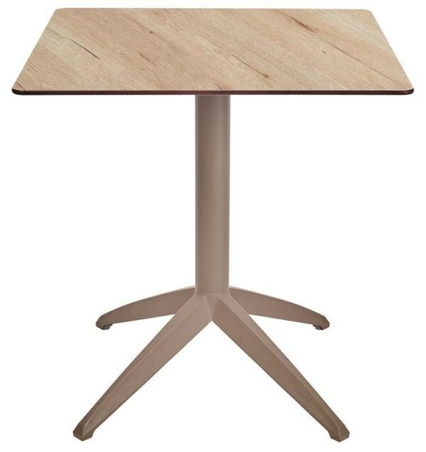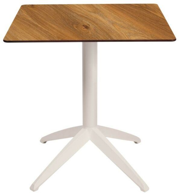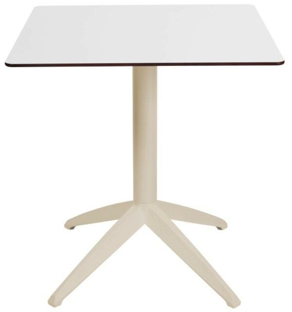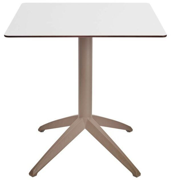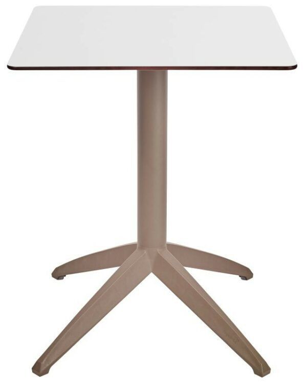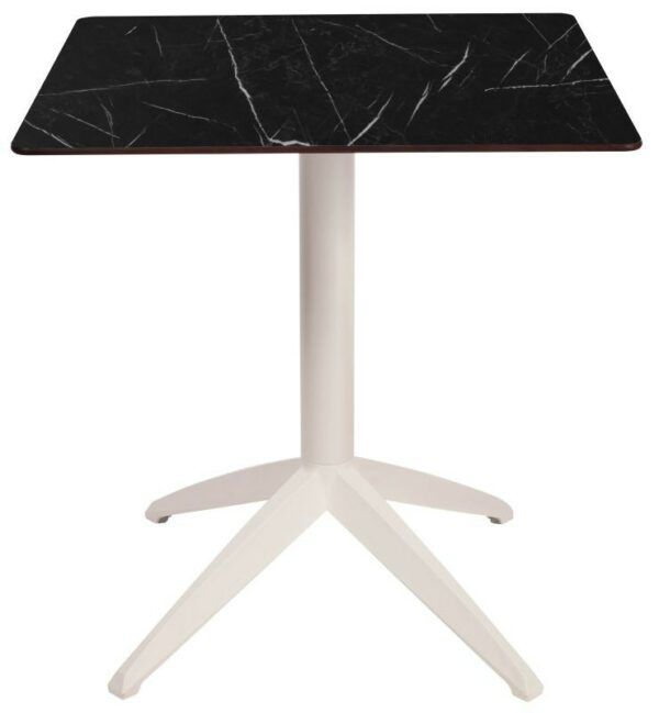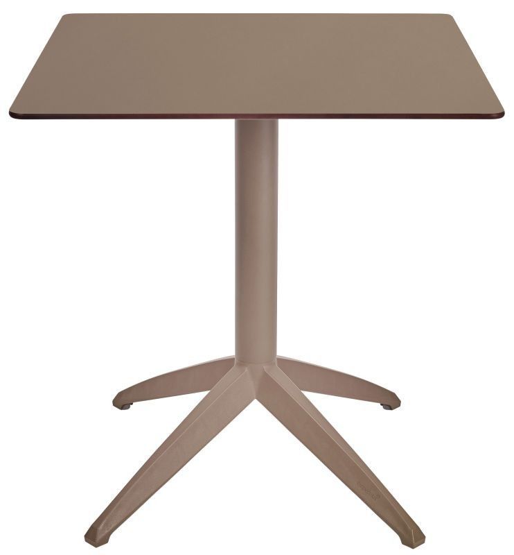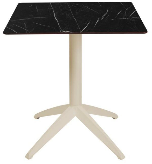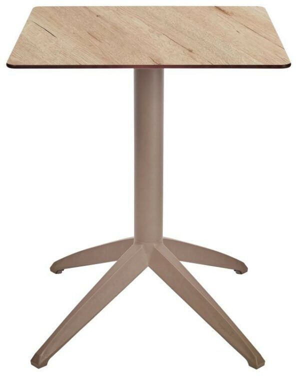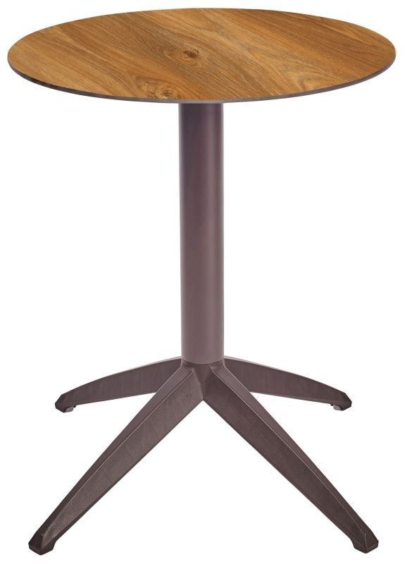 Mesa abatible para interiores y exteriores con tablero compacto y estructura de aluminio lacado.