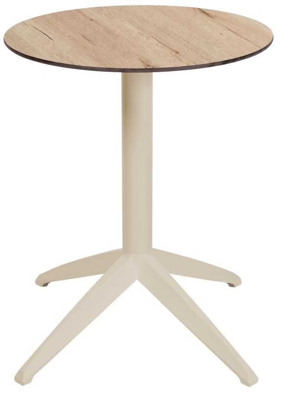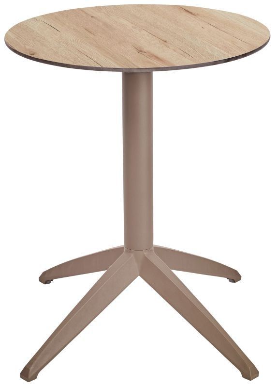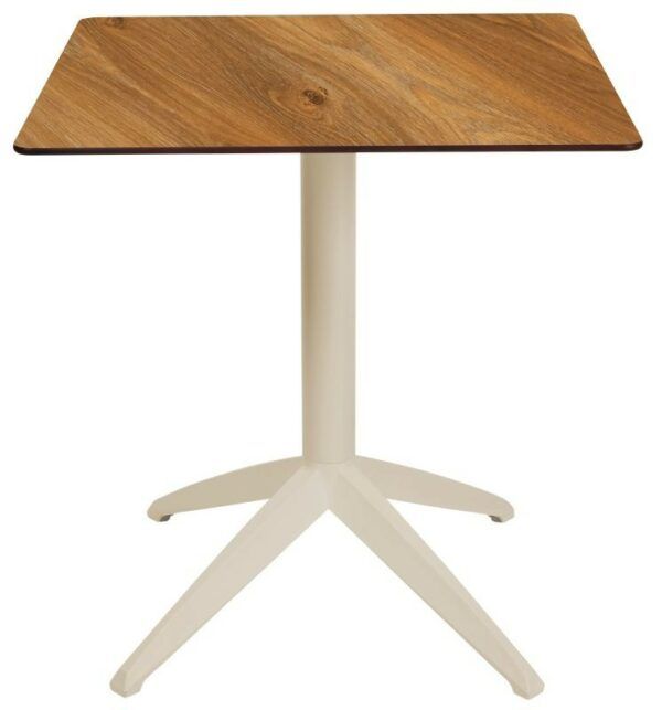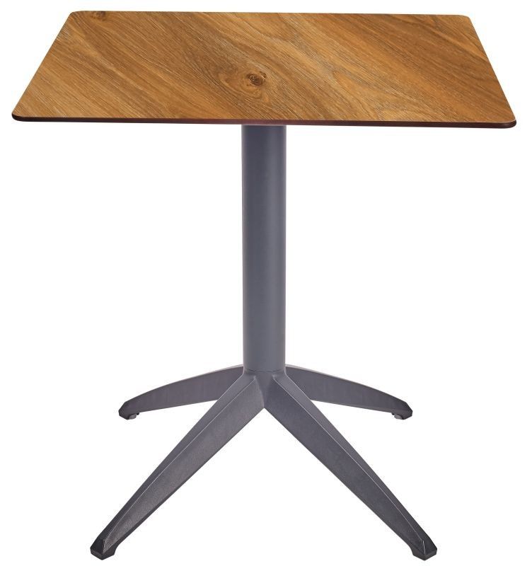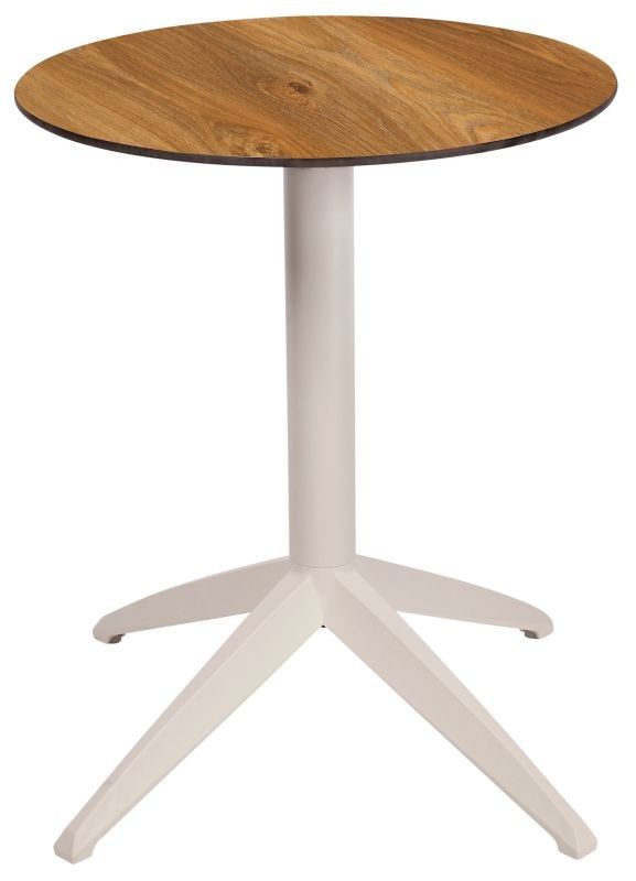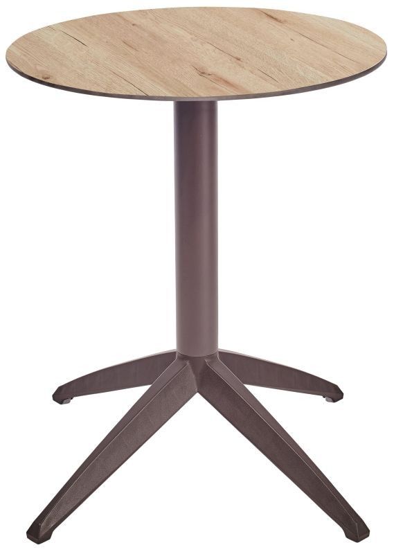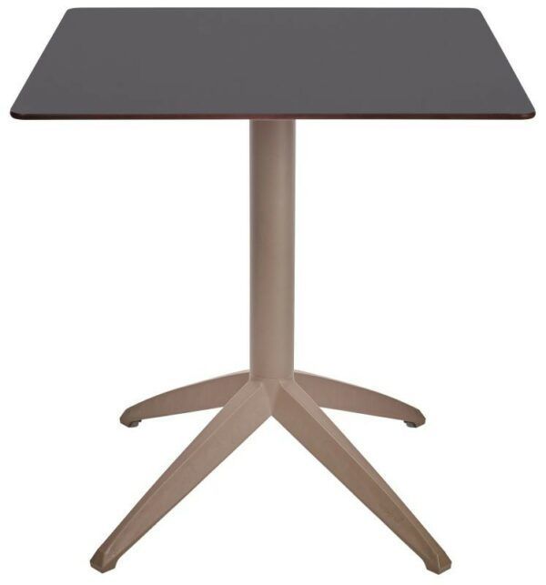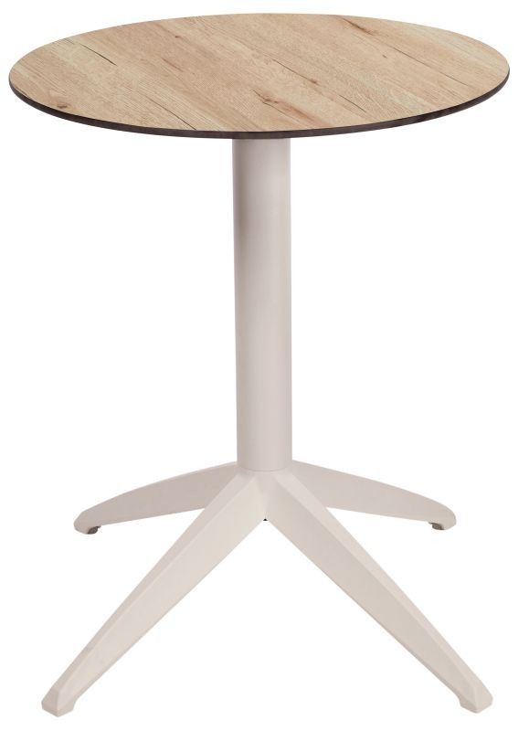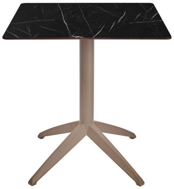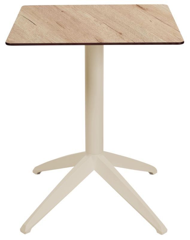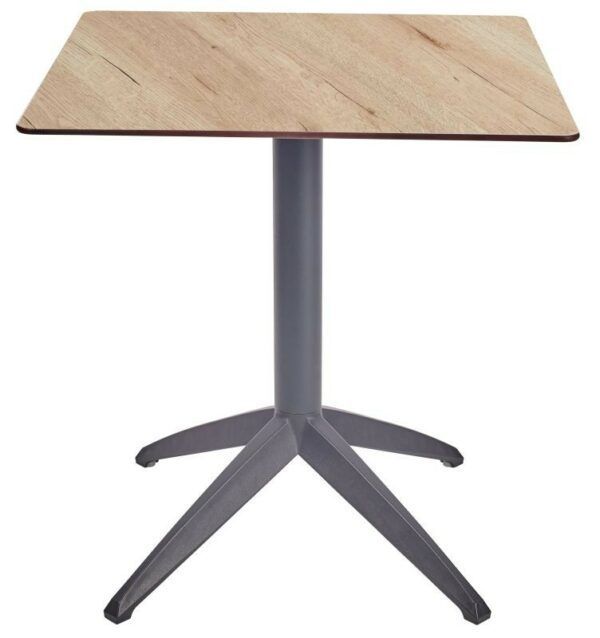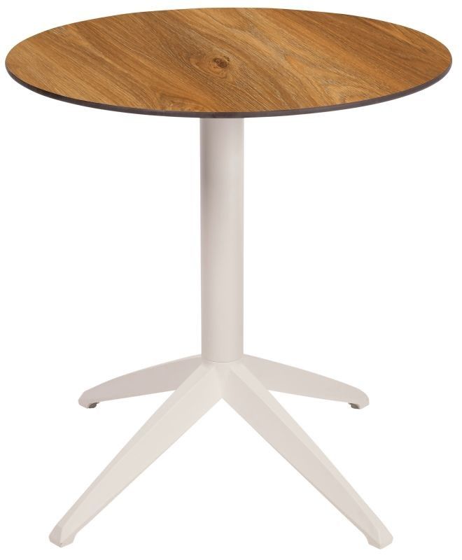 Mesa abatible para interiores y exteriores con tablero compacto y estructura de aluminio lacado.