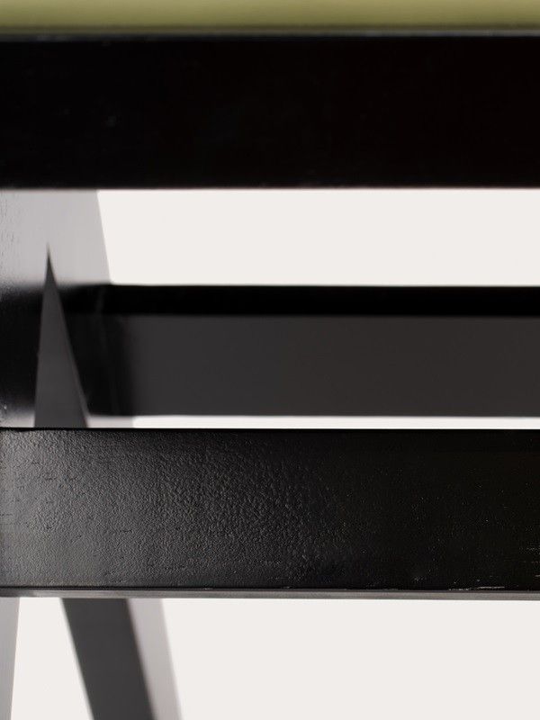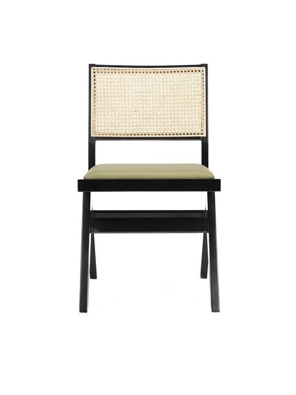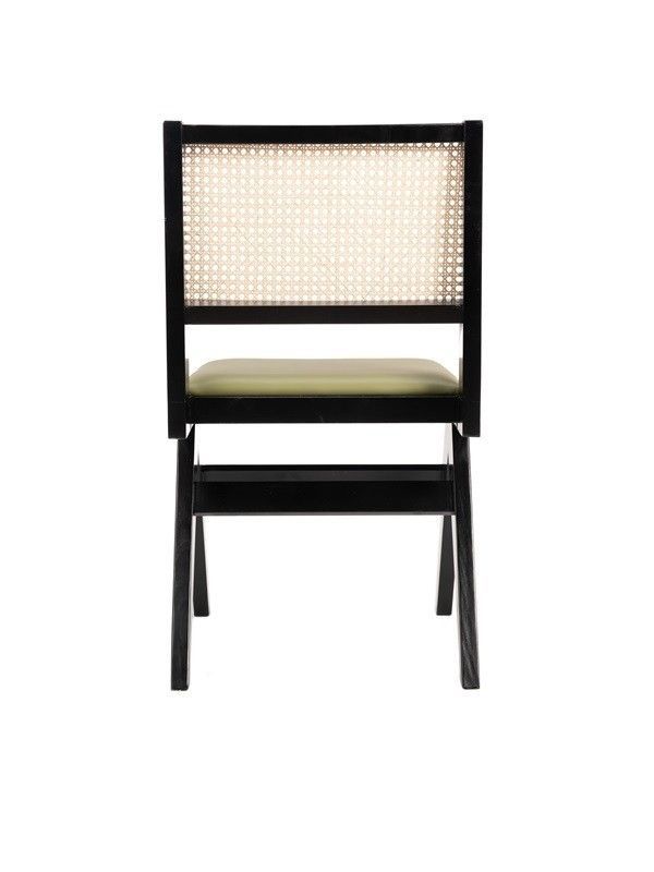 Silla de comedor de madera de haya en color negro con respaldo de ratán autentico y asiento de polipiel en verde.