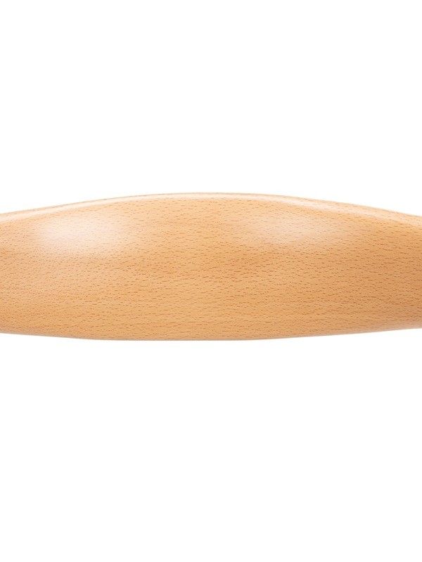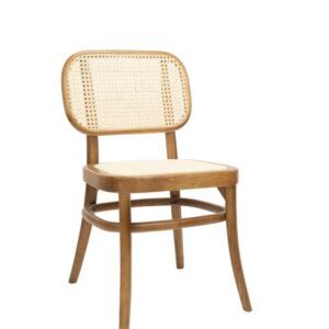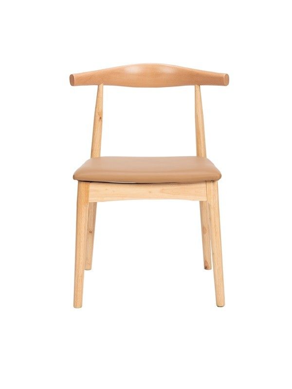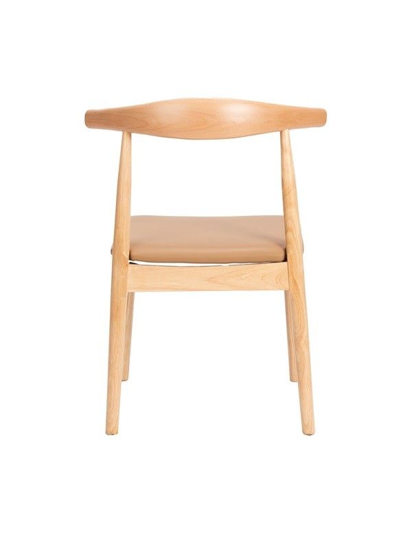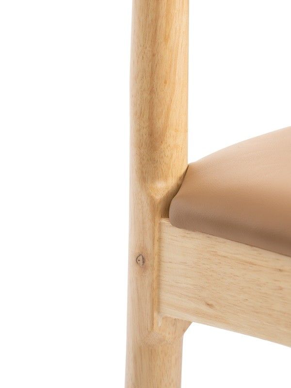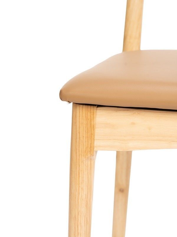 Silla de comedor de madera en color natural con asiento de polipiel en color marrón.